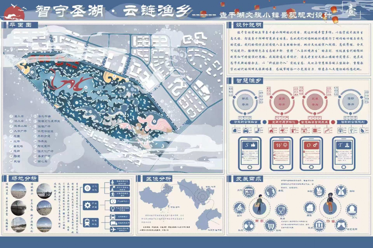 本图通过对查干湖文旅小镇的调查以及分析整理问题并进行了详细的前期规划,引入了“生物城市”的概念,并且对此地进行了详细的规划和设计,道路分为三级道路,在景观的功能上有入口景观区,文化体验区,民俗展示区,民宿体验区,生态整合区,文化科普区,滨水体验区等六大功能分区,营造了具有活力和新鲜感的特色文化景观。
