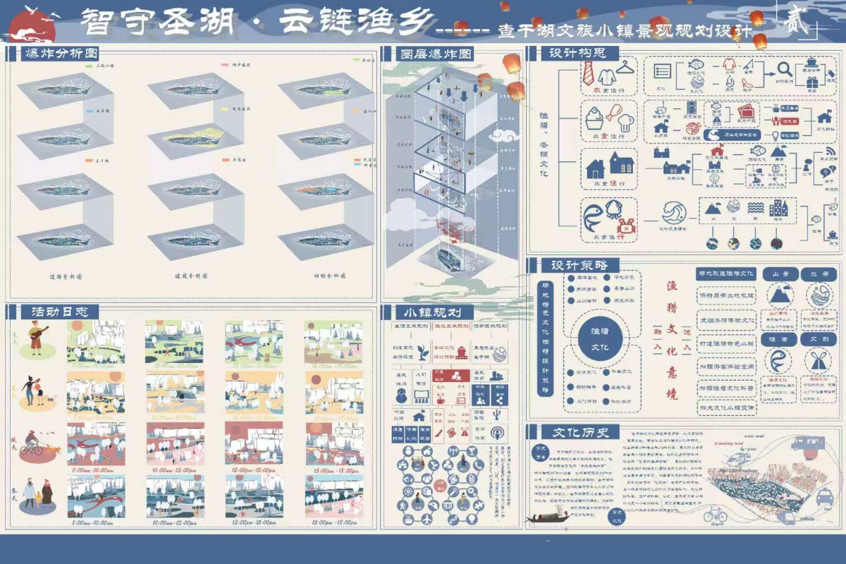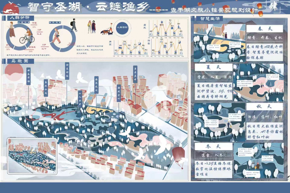 本张图展示了各个地区的空间分析,以及季节变化特点,分析了来往人群以及人数,加强渔文化的科普,增加了健康步道,供人们与运动以及休闲,增加了小镇的空间感和体验感。同时鸟瞰图展示了设计中的“渔戏水间”“神来神往”“似入水中”“身居其中”“游戏莲叶”等特色文化的细节展示,增加了小镇的文化特色。