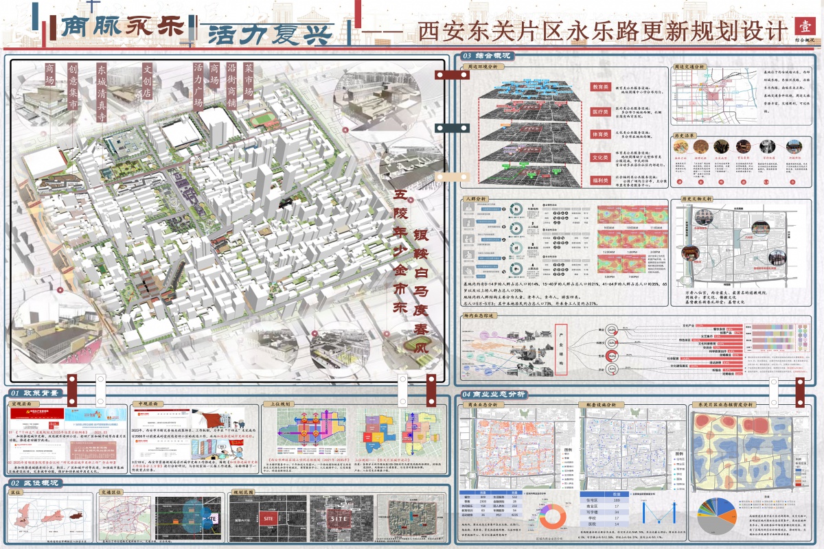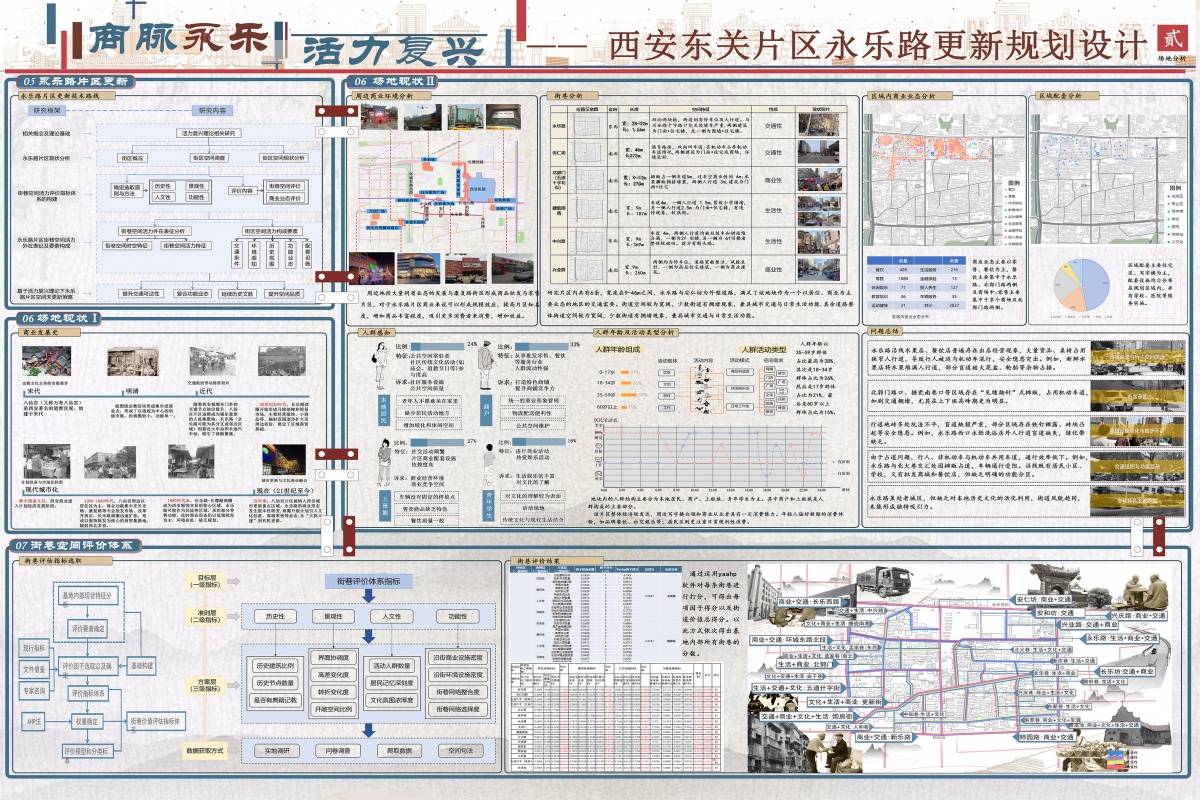 交通系统通过提升道路通行能力和人车分流效率缓解拥堵,采取主干道拓宽、增设隔离设施、优化支路系统、规划临时停车区等措施。永乐路街区改造以 “文化 - 商业 - 生活” 三元融合为方向,打造特色空间节点激活区域活力;西北商贸中心在保留原有商业功能基础上,新增亲子娱乐、文创展示等创新业态,植入绿化景观营造开放共享空间,结合常态化文化活动强化场所文化特质、延长游客驻留时间;传统菜市场改造挖掘 “场所记忆、情感共鸣、集体认同” 价值,推动从单纯交易场所向 “交易 - 社交” 复合空间转变。