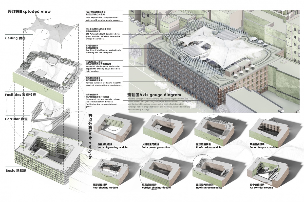 上海隆昌公寓模块化修复改造依托建筑空心结构,通过ETFE气候适应性模块、CTL太阳能光伏板等12类预制模块,实现历史肌理保护与功能升级。施工采用BIM技术精准拼装,垂直绿化、屋顶阳光房模块串联立体生态,空中走廊与单侧空间模块激活公共界面。爆炸图清晰呈现“基础层-廊道-设施-顶面”四层模块化体系,节点分析图凸显遮阳系统动态调节、光伏板与结构一体化等技术创新,展现旧住区可持续更新的多维解决方案。