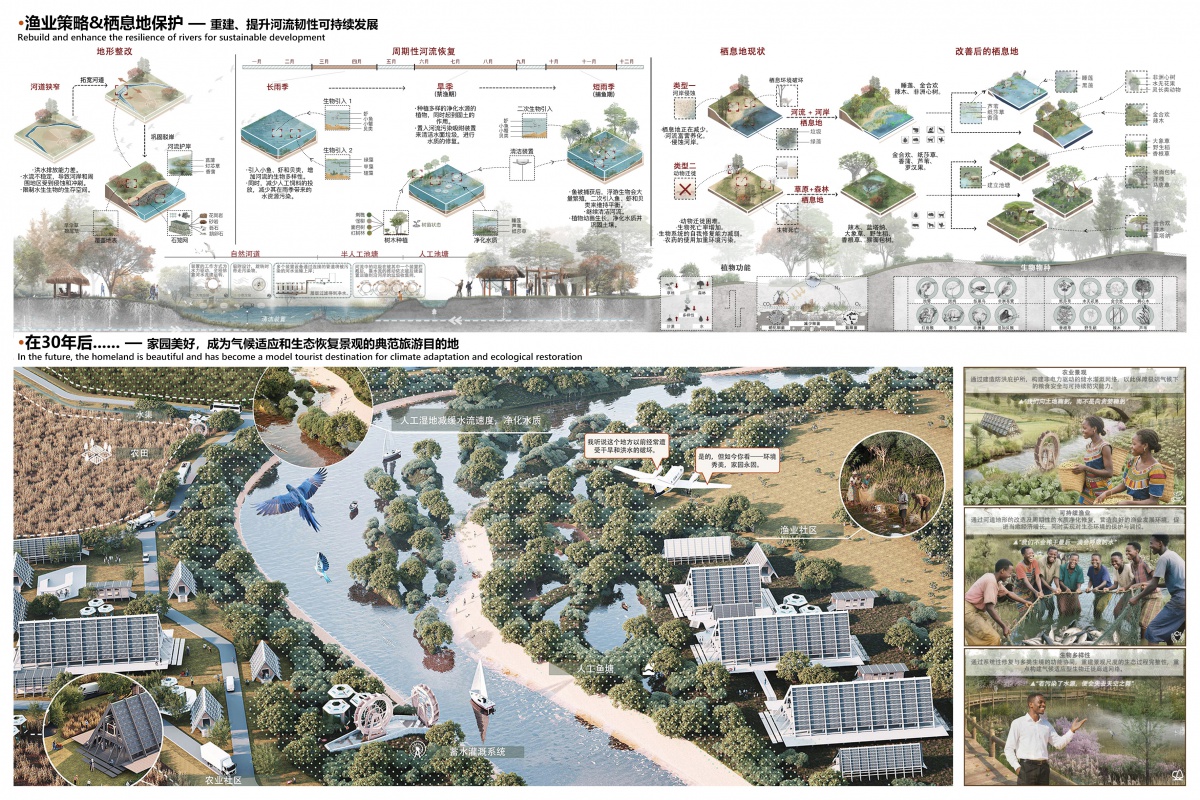 方案在生态科学与本土智慧之间建立了深刻的桥梁,以“生态水廊道”为核心,巧妙整合农业、渔业与栖息地修复三大系统,展现了系统性与前瞻性并重的设计格局。作品回应了洪涝灾害带来的环境与生计挑战,通过低技、可持续的设计策略,如水车-水罐灌溉与垂直农场,提供了极具操作性与适应性的解决方案。其创新之处在于超越单纯的生态修复,将自然过程、经济发展与社区文化复兴紧密融合,形成了一个具有社会韧性和生态复原力的整体系统。整体设计逻辑清晰,策略精准,既尊重了巴努族的传统智慧,又引入现代生态工程,最终实现人与自然的和谐共生。