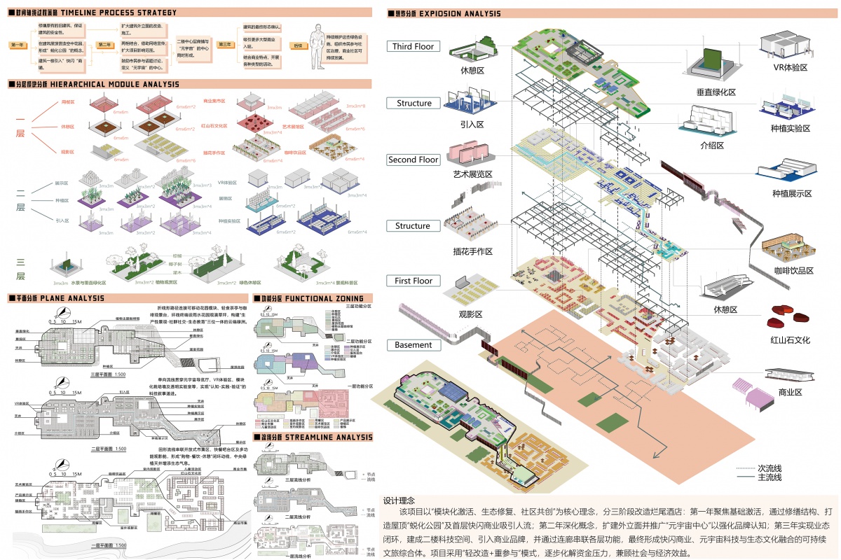 作品关注于存量时代下的城市建筑改造,关注资金和城市更新的压力,创新的提出了分段式建设、模块化建设、智慧建设的方式,对于城市更新时代的规划设计有启示意义和应用价值