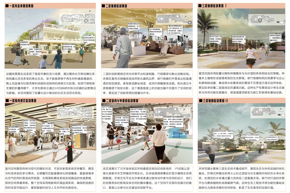 最后,请欣赏我们的区域效果图,如图所示,一层空间可达到文创市集、快闪活动的展开,二层则为VR元宇宙体验区,顶层花园尽显生态之美。