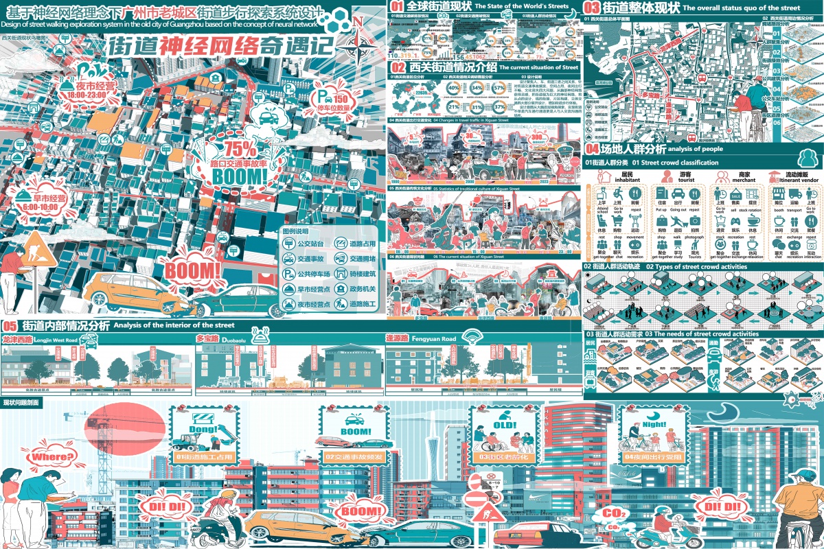 针对当前城市街道普遍存在的“街道交通事故频发的安全隐患、空间占用混乱、夜间出行不畅等痛点问题。融入在地文化元素重塑场所记忆。点、线、面、立体交通”对应神经网络原理,提供了景观设计的跨学科新思路。