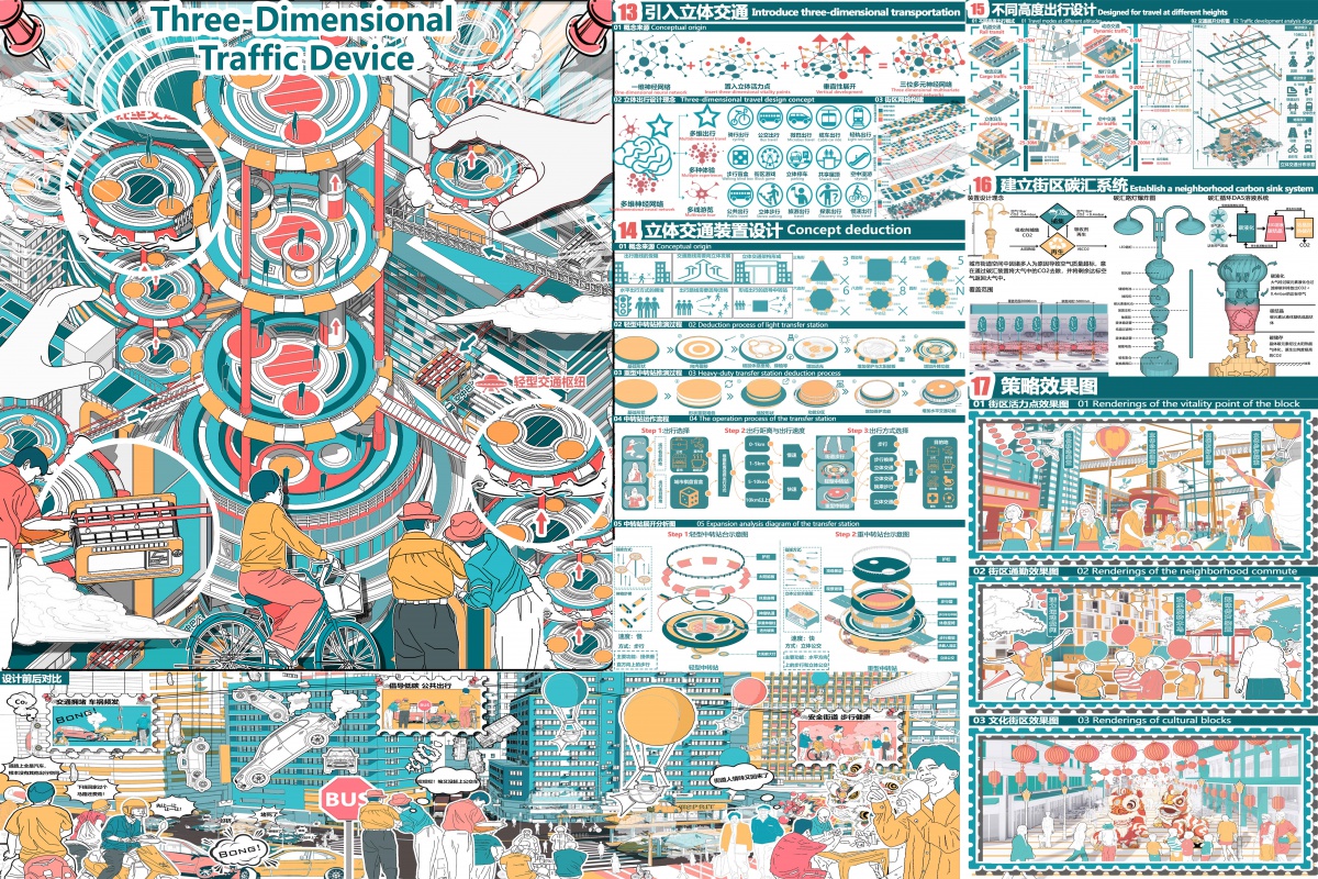 设计理念较为创新,将街道比作神经网络,以“点-线-片区-立体”四维策略系统性地回应了人车矛盾与空间失活等核心问题。方案兼具理论深度与实践价值。