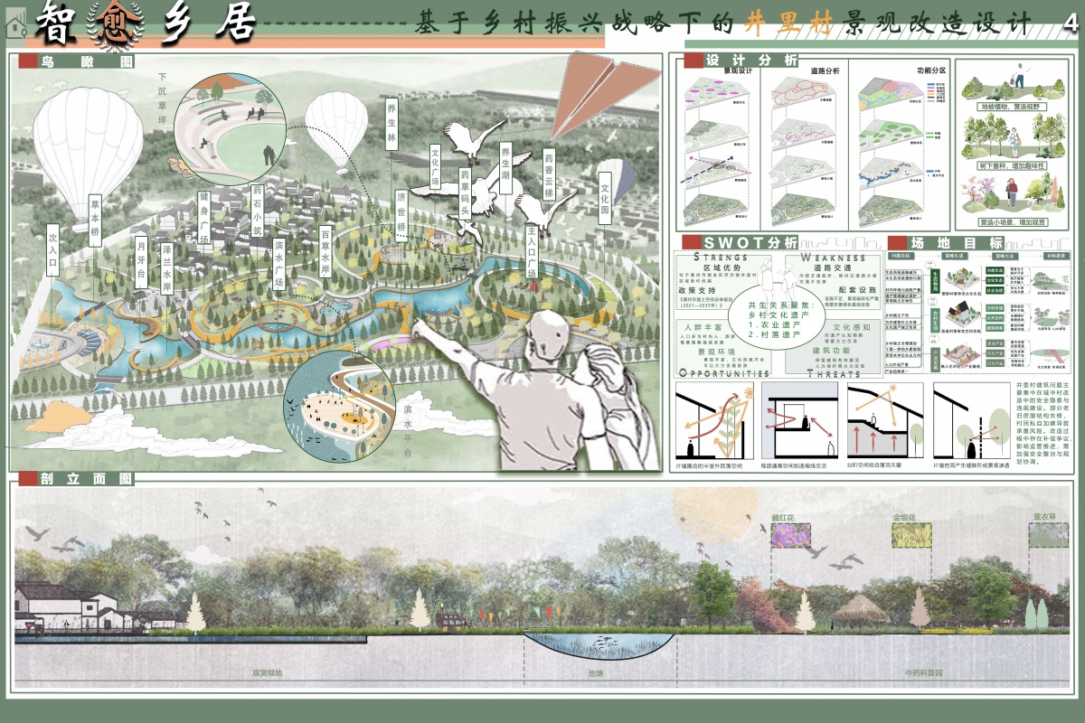 以鸟瞰图直观展现了井里村景观改造后的整体风貌,呈现出错落有致的建筑、绿意盎然的生态空间与功能完备的公共区域;SWOT分析则全面梳理井里村的优势、劣势、机遇与挑战,通过辩证思考,提出针对性的解决方案,平衡发展矛盾,探寻文化传承与文旅融合新路径。