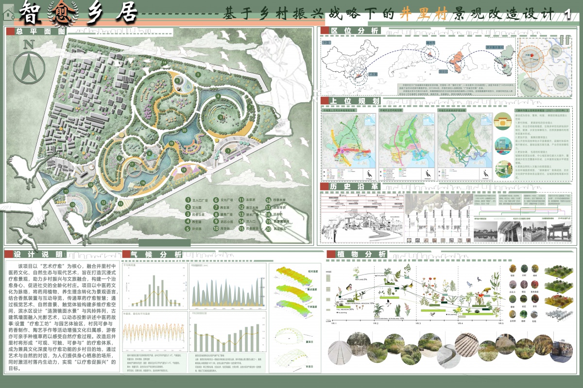 区位分析明确了井里村在区域交通中的定位,凸显其基于乡村振兴战略下的地理优势与潜在机遇;上位规划解读了国家、省市级有关乡村发展的政策,为村庄改造指明了方向;历史沿革梳理村落文化脉络,挖掘传统中医药文明与民俗特色;植物分析结合本地植被类型,探寻适生植物群落;气候分析则综合光照、降水等数据,为生态景观营造提供了科学的依据。