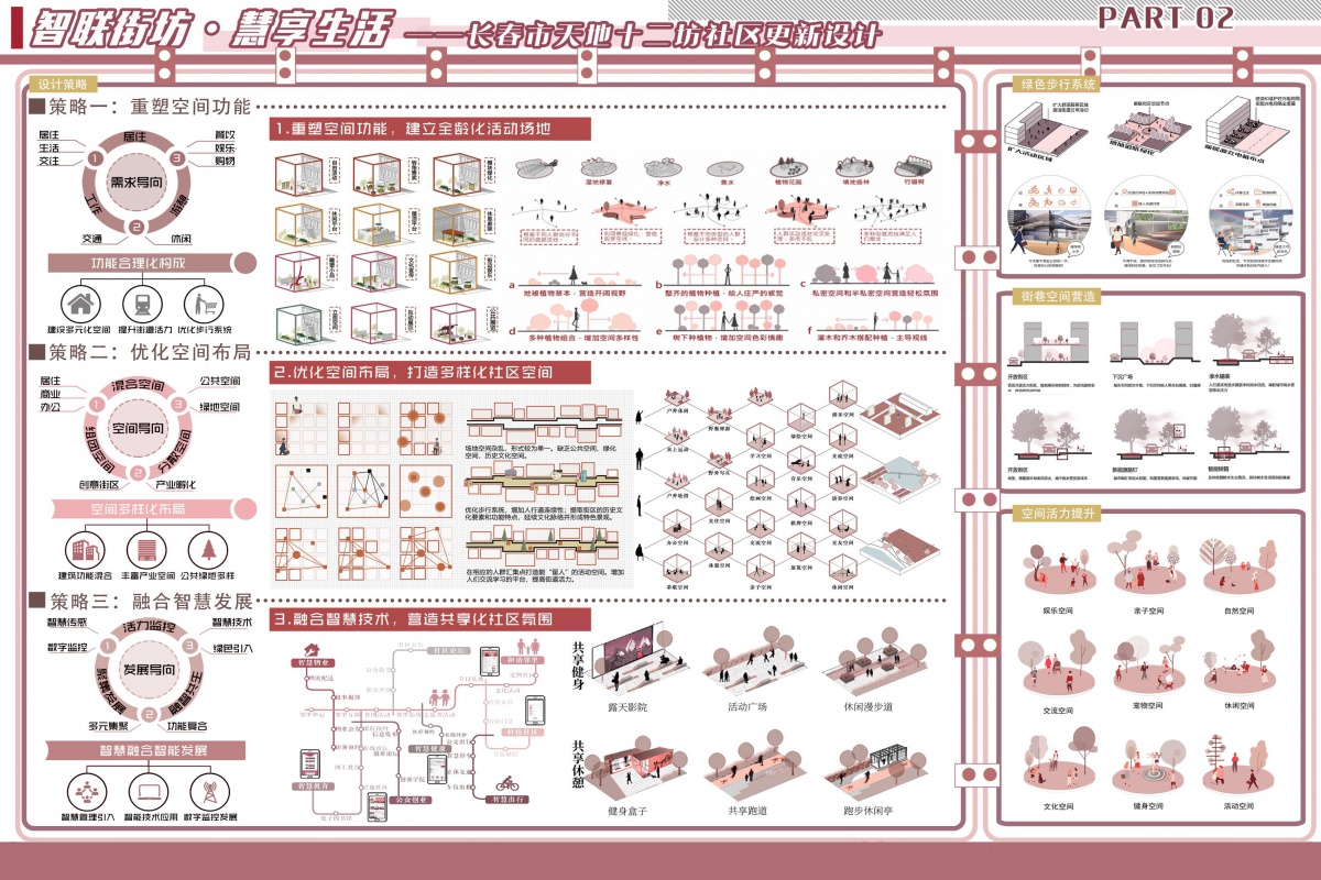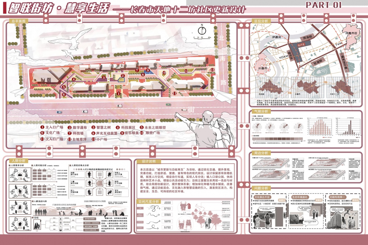 以“智联街坊·慧享生活”为核心理念,聚焦长春市天地十二坊社区更新。秉持需求导向,围绕居住、生活、交往、工作、休闲等多维度需求,重塑空间功能;以空间为导向,统筹居住、商业、办公等混合空间及公共、绿地空间,优化布局;以发展为导向,融合智慧技术,推动社区智慧化、共享化发展。