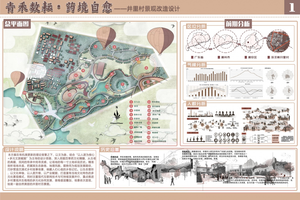 充分利用场地原有生态基底,如结合地形地貌进行景观营造,对现有水系、植被等进行保护与合理改造,减少对自然环境的破坏,实现生态友好型施工。运用仿古建筑工艺,对具有历史文化价值的建筑或场景进行修复与重建,同时采用雕塑、标识系统等手段,将百草药文化元素融入景观节点,如打造药草亭苑、药田拾趣等场景时,注重文化符号的精准表达。引入现代互联网技术,在施工过程中利用数字化手段进行进度管理、质量监控等,同时为后续的智慧导览、线上文化展厅等智慧化运营提前布局,实现施工与运营的智慧化衔接。前期分析涵盖区位、气候、人群等多个维度,区位分析清晰展示井里村在广东省、潮州市、潮安区、浮洋镇的位置关系;气候分析通过图表直观呈现当地气候特征;人群分析则对不同人群的需求与特征进行剖析,为设计提供全面且精准的依据。