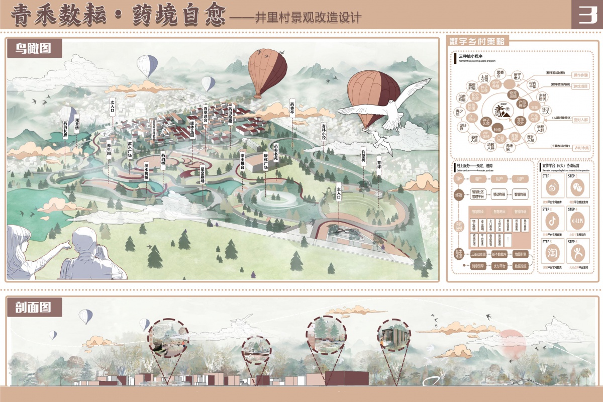 搭建数字乡村相关系统,如“云种植小程序”的开发与部署,涉及前端界面设计、后端数据管理与交互逻辑构建;线上服务平台(如智慧社区管理、移动终端、智能终端等)的安装与调试,实现用户注册、选购等功能的顺畅运行。鸟瞰图清晰呈现井里村改造后的整体空间格局,主入口、次入口以及药香亭、养生园、演艺广场等众多景观节点分布明确,能直观感受到乡村景观的丰富性与系统性。