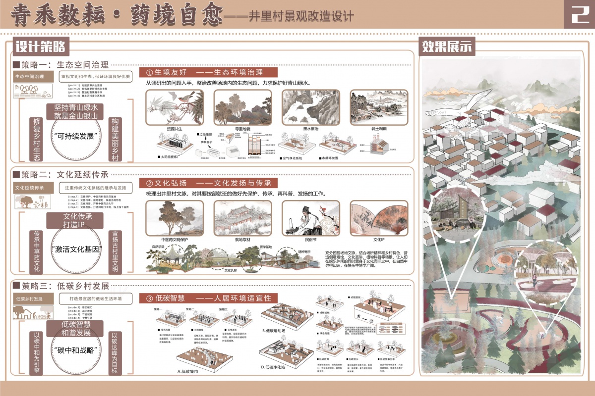 秉持“绿水青山就是金山银山”理念,通过生境友好的生态环境治理,如资源共生、尊重地貌、理水整治、渣土利用等,修复乡村生态,构建美丽乡村,推动可持续发展。梳理井里村文脉,做好中医药文明保护、利用就地取材打造场景、以“碳中和战略”为指引,以碳达峰为目标,打造低碳智慧、和谐发展且宜居的低碳生活环境,涵盖低碳集市、低碳运动场、低碳净化站等场景打造。
