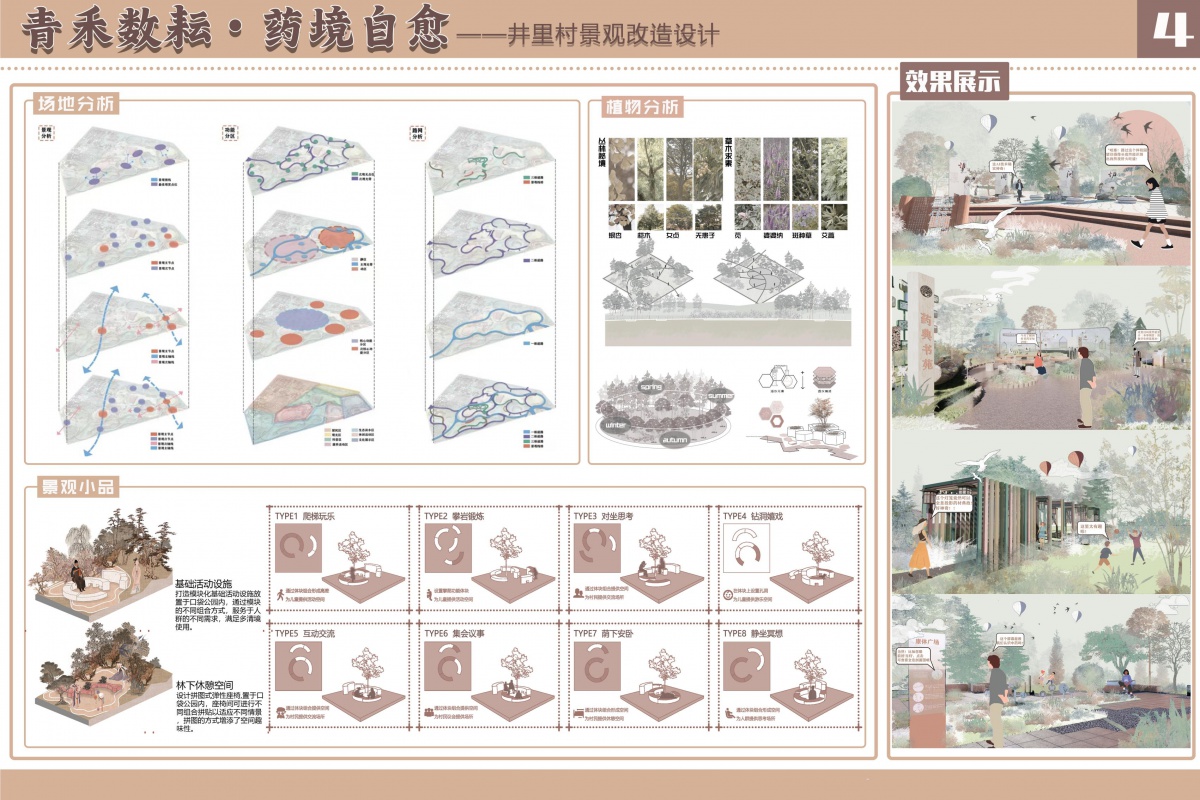 依据场地分析结果,对地形、水系等进行合理改造,利用土方工程技术塑造微地形,通过水利施工技术优化水系布局,为景观营造良好的基底。结合植物分析,科学选择药用及景观植物,采用生态种植技术,注重植物的搭配与季相变化,确保植物成活率与景观效果的长期稳定。针对不同类型的景观小品。右侧的效果展示图生动呈现了改造后的景观场景和人们使用智能数字进行互动的场景。