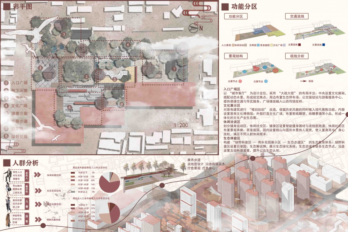 秉持“催化激发、文化复苏、生态和谐、活力增进”的核心思想,主要将场地划分为四个区域:入口广场区、文化展示区、休闲洽谈区及生态体验区,每个区域都有独特的功能和定位,入口广场区作为整个区域的门户。承担着迎宾和引导的功能,文化展示区集中展示区域的历史文化和特色,休闲洽谈区为人们提供交流和休憩的场所,生态体验区让人们亲近自然、体验生态之美,通过城市设计中精准植入各种催化元素,如艺术装置、互动设施等,有效激发场地的潜活力,进实现场地功能布局、文化内涵、生态环境和空间品质等方面的全面升级,打造出一个既具有文化底蕴又充满生态魅力的现代化城市空间。