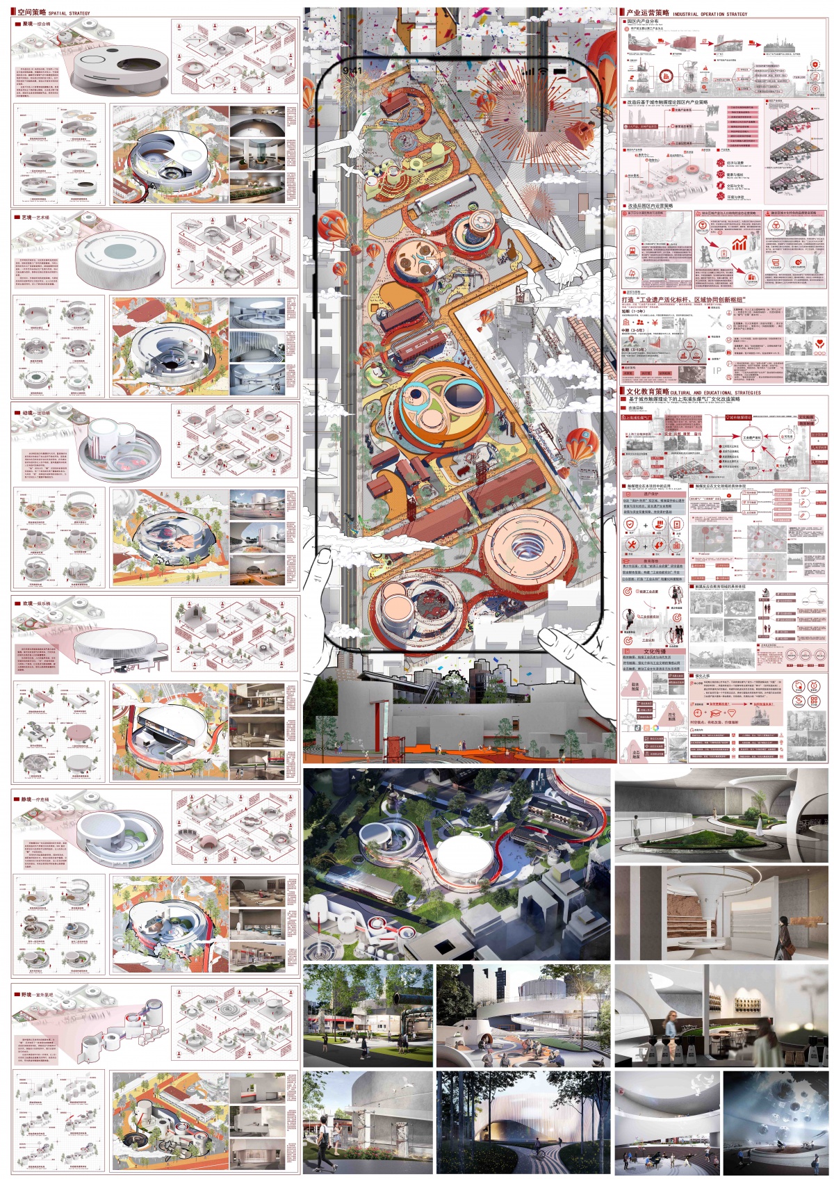 该部分主要是效果图的展现以及产业运营、空间策略、教育策略等,其中产业策略展示园区产业转型策略:从停产前的第三产业,转向融合文化、康养、购物等多元业态,构建工业记忆与健康福祉并重的城市触媒体系