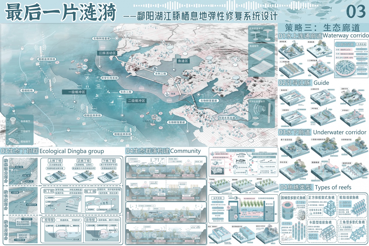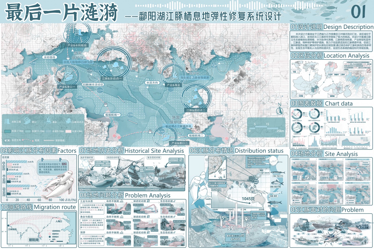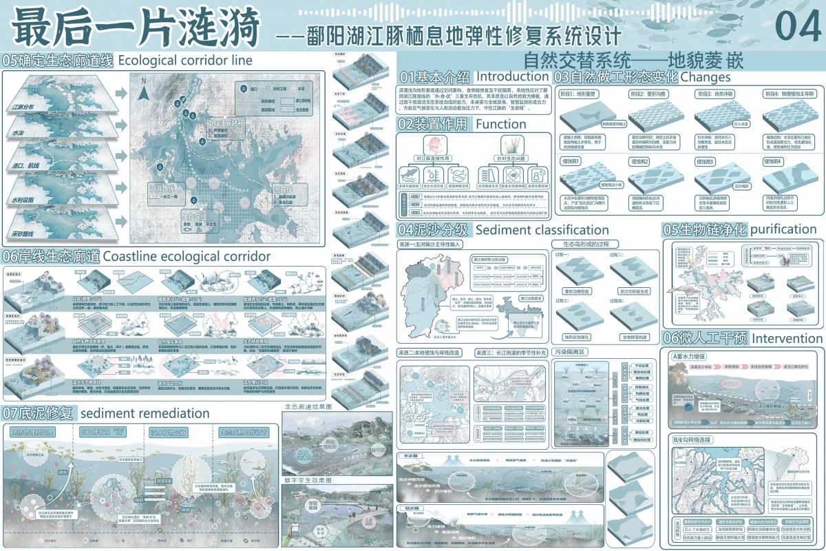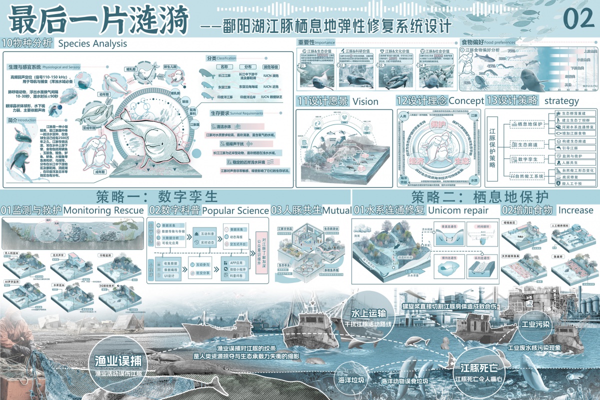 该设计聚焦鄱阳湖江豚栖息地修复,创新 “栖息地修复 - 生态连通 - 智慧守护” 三维策略,数字孪生技术与自然做工系统融合突出,可视化与叙事逻辑清晰,为淡水豚类保护与生态智慧修复提供了兼具科学创新与社会价值的实践范式。