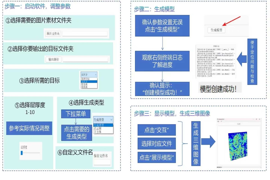 本界面秉承 “流程化引导” 设计理念,将复杂建模简化为七个直观步骤,极大降低操作门槛。其核心技术为基于序列二维切片的点云生成与体素化算法,通过插值处理构建高精度模型。亮点在于终端日志实时反馈和参数灵活可调,实现了科研精度与操作便捷性的统一。