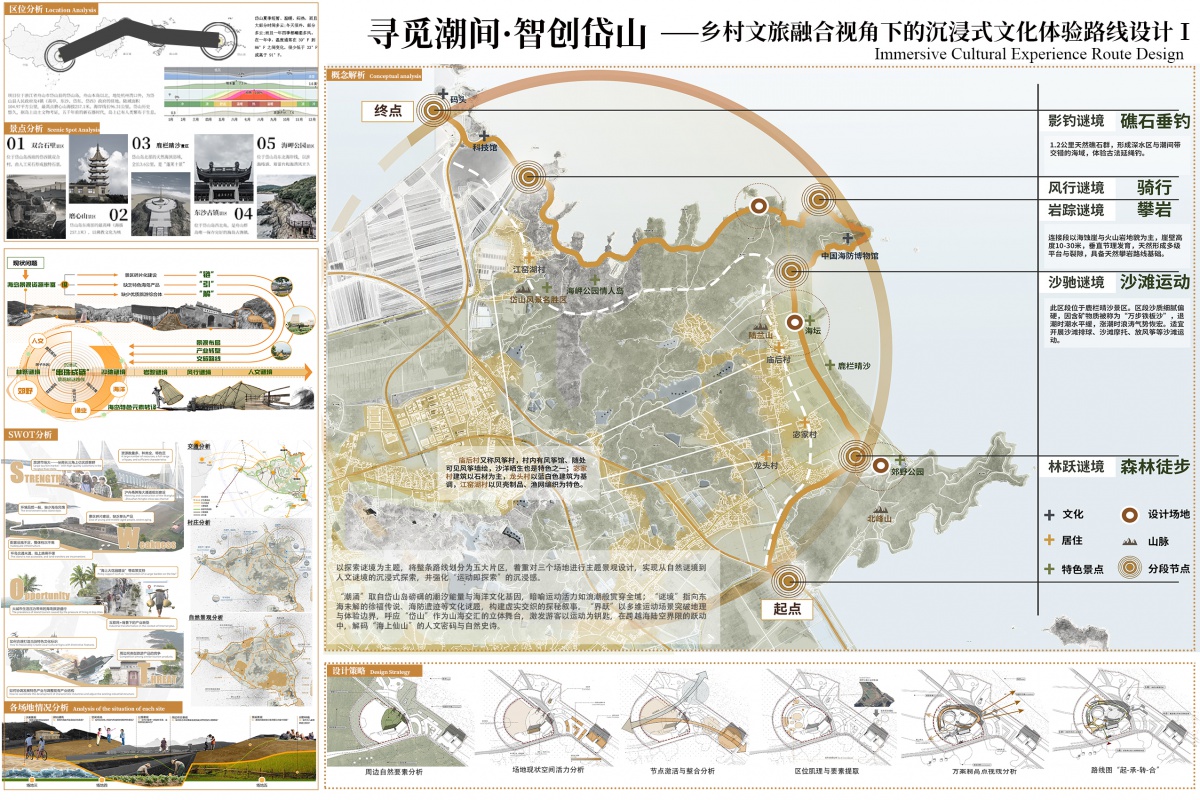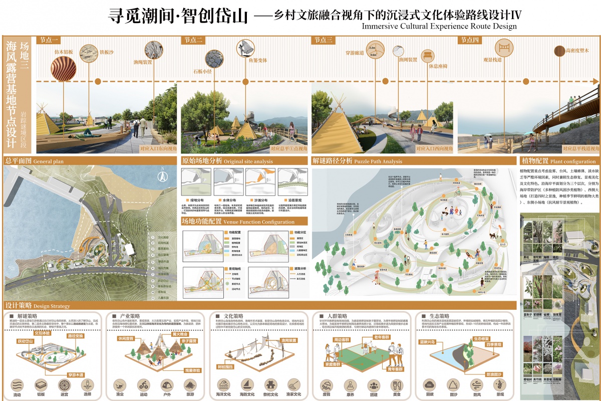 概念生成:海岛景观资源丰富,但存在景区碎片化建设、缺乏特色海岛产品、缺少优质旅游综合体等现状问题。基于此,以 “串珠成链” 为核心思路,从景观布局、产业转型、文旅路线三方面着手,打造沉浸式景观解谜路线,涵盖林跃谜境、沙驰谜境、岩踪谜境、风行谜境、影钓谜境等,同时转译海岛特色元素,融合人文、郊野、海洋、渔业等多元领域,如设置露营基地、亲子乐园等,旨在解决现有问题,推动海岛文旅发展,经此路线达成海岛文化的沉浸式体验。