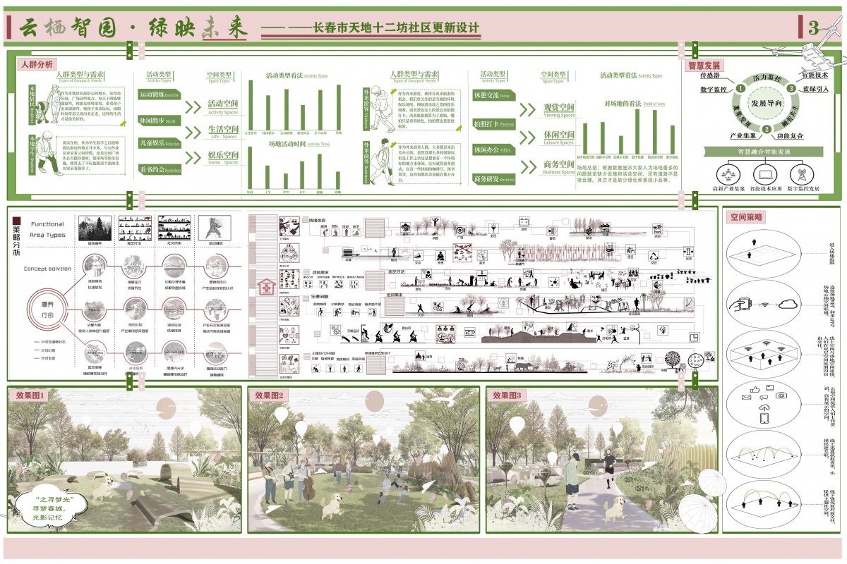 人群分析展示了不同人群(如居民、学生、外来游客等)的活动类型、空间类型等;智慧发展部分涉及传感器、数字监控等智能技术;策略分析有不同功能区域的概念解决办法;还有效果图,展示了社区更新后不同场景的效果,以及空间策略等内容。