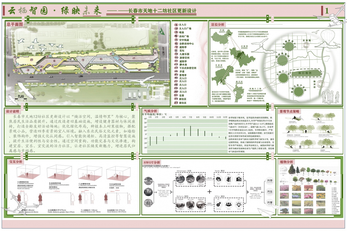 总平面图展示了社区各区域的布局;区位分析介绍了社区的地理位置;设计说明阐述了更新设计的核心和具体做法;气候分析呈现了不同月份的平均温度;景观节点策略展示了不同景观节点的设计;还有交互分析、SWOT分析和植物分析,分别从居民交互、社区优劣势以及植物选择等方面进行了说明。