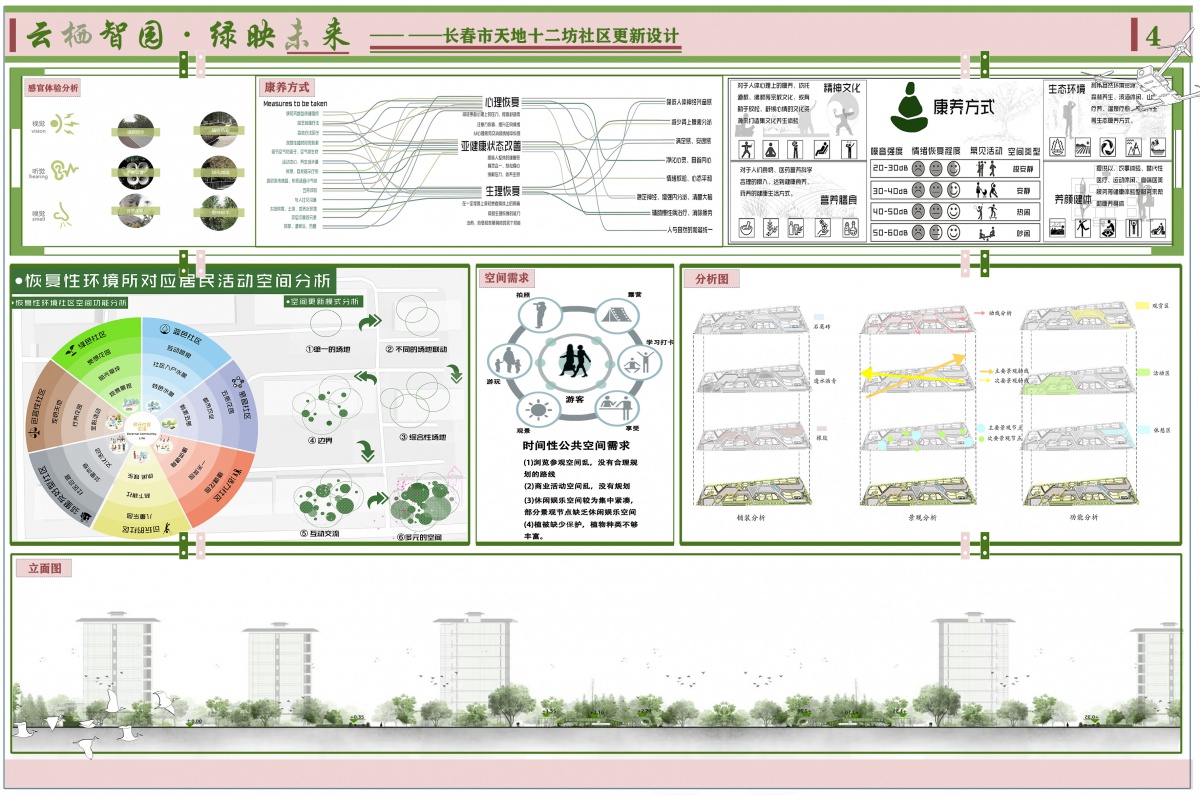 有感官体验分析,展示了视觉、听觉、嗅觉等方面的元素;还有康养方式,涉及心理恢复、亚健康状态改善、生理恢复等,以及精神文化、生态环境相关的内容,像不同噪音强度对应的情绪恢复程度、常见活动和空间类型等;另外还有恢复性环境对应居民活动空间分析、空间需求、分析图和立面图等,立面图呈现了社区建筑和周边绿化等景观的侧面效果。