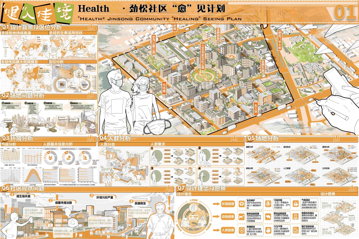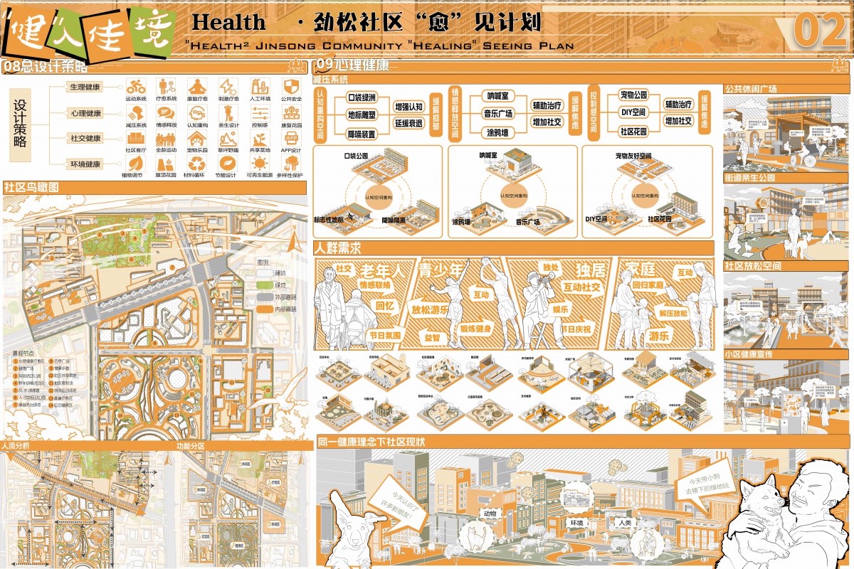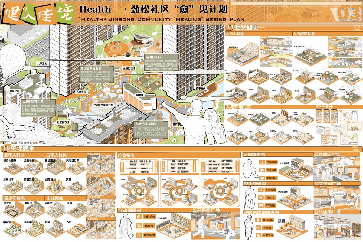 作品敏锐捕捉到老旧社区中普遍存在的公共空间老化、代际互动缺失与健康设施不足等现实问题,以“同一健康”理念为核心,提出从生理、心理、社交与环境四个维度全面提升居民健康水平的系统策略。设计巧妙结合全龄运动环道、康复花园与情感疗愈空间,为不同人群提供兼具功能性与关怀性的使用场景;通过社区客厅、共享菜地与宠物乐园等节点,重建邻里互动与归属感;同时,生态调节与低碳技术的应用,为社区营造出可持续、智慧化的绿色环境。尤为亮眼的是数字化平台的引入,实现设施预约、健康管理与社群互动的联动,使空间运营更高效、更具参与性。