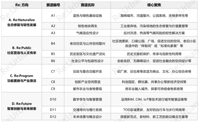 本次大赛设立 “建成项目类”、“规划与概念类” 二大类别,共同参与下述十二大赛道的角逐。