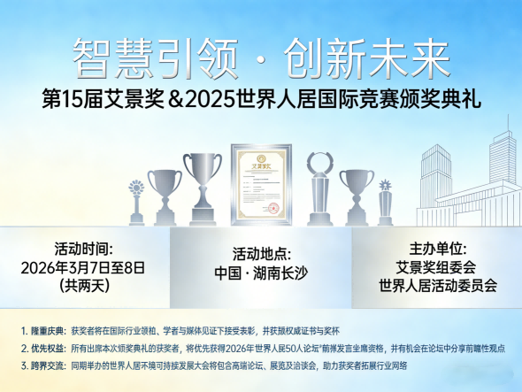 第十五届艾景奖与2025世界人居设计大赛颁奖盛典,将于3月7-8日在长沙隆重合并举行。获奖者将在国际业界见证下接受表彰,并获邀优先参与2026世界人居50人论坛前排发言。诚邀全球获奖代表共聚星城,以智慧与创意,共筑未来人居。
