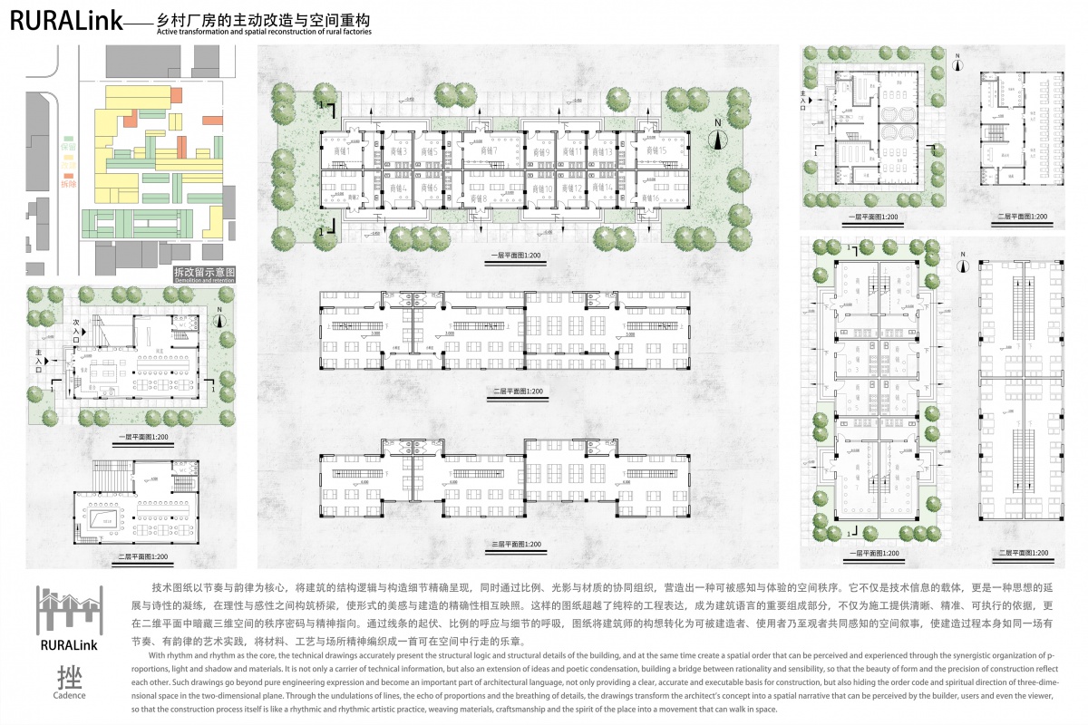本项目的技术图纸通过精确的比例和细节展示了RURALink空间的结构与建造逻辑,体现了项目在“抑扬顿挫”的设计理念下的深度与严谨性。图纸不仅呈现了建筑的技术结构,还通过比例、光影与材质的精确表达,传递了项目的空间韵律和形式美感。
