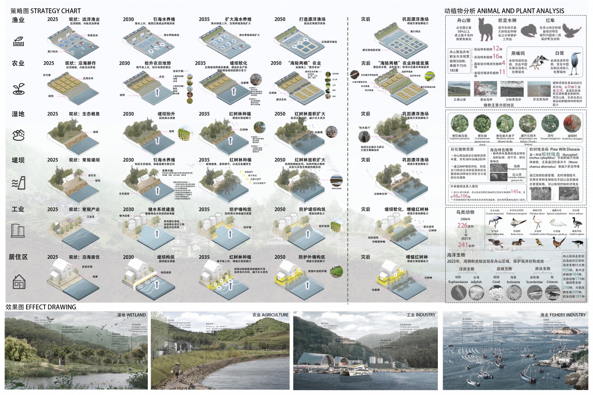 底部效果图按湿地、农业、工业、渔业 分类,将抽象策略转化为可视化场景:湿地展示 “红树林+水系” 生态修复后的自然景观;农业呈现 “抬升田势+生态种植” 后的田园韧性空间;工业/渔业体现 “生态化改造” 后的生产场景(如工业码头融合生态护岸 );用场景验证策略落地性,强化 “生态与生产/生活兼容” 的规划逻辑。