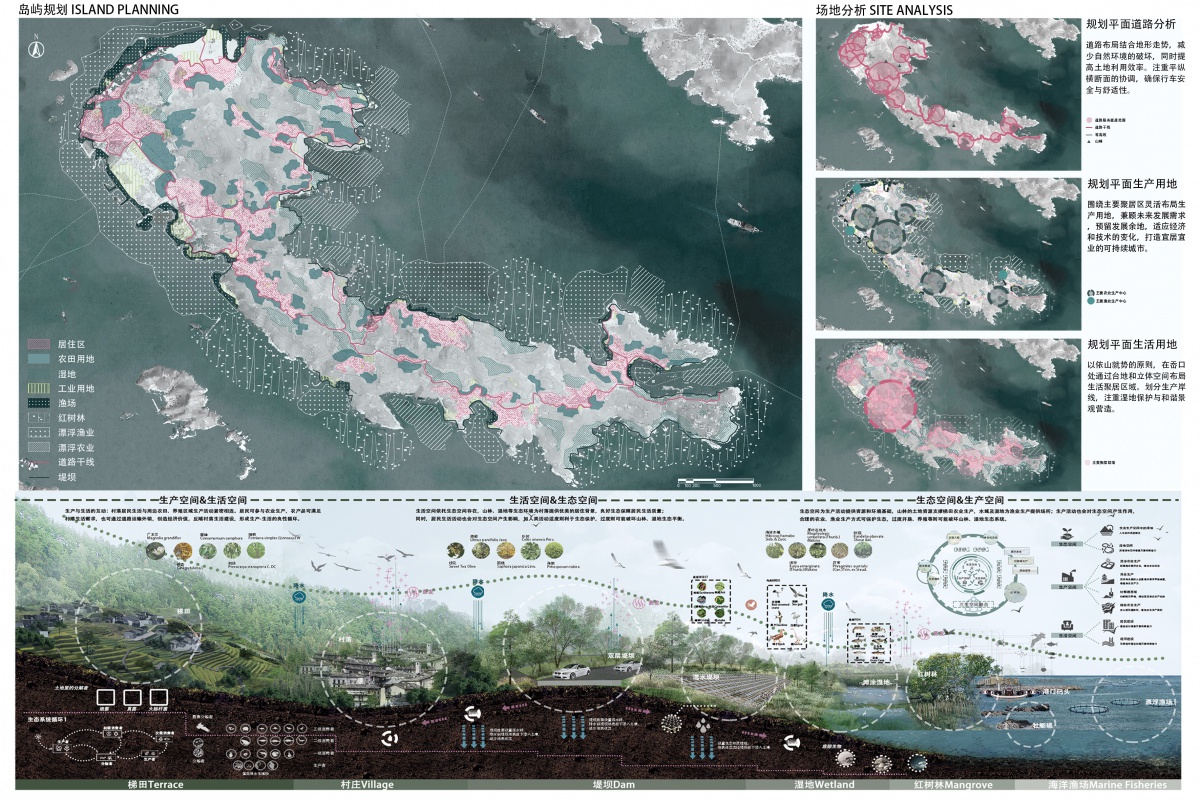 团队聚焦“岛屿三生空间(生产、生活、生态)协同规划”,以 “生态优先、三生融合、业态协同” 为核心,构建 “抗灾+生态+生产生活协同”的韧性岛屿。左侧岛屿规划”图用颜色区分居住区、农田、湿地、工业等 8 类空间,呈现 “生态空间(湿地、红树林 )为底,生活空间(居住区 )、生产空间(农田、工业 )镶嵌其中” 的格局,体现“生态优先,生产生活有序嵌入” 的规划逻辑。右侧场地分析拆解“道路、生产、生活用地”三类子项:顺应 “低山滨海” 地形,构建 “少占生态空间+串联生产生活” 的路网;“集中化+生态化” 生产空间布局(如漂浮渔业、生态农业),降低对生态的干扰;“依山就势 + 组团化” 生活用地设计,呼应 “生活空间+生态空间” 融合,通过子项拆解,验证整体规划的空间合理性,让 “三生空间” 落地更具依据。