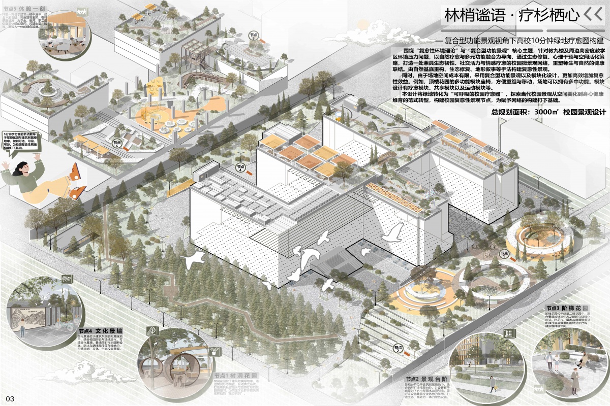 大学生心理问题是值得关注的社会问题,该作品以自然疗愈为引擎,空间节约为基础,从园林景观的角度重构校园生态、文化、景观和休憩空间系统,通过地形叙事引导心理减压流线、模块化三态切换设计、轻量化再生基质与雨水循环系统三个方面的场地复合性规划设计,构建出"垂直复愈景观系统",并取得良好的疗愈效果