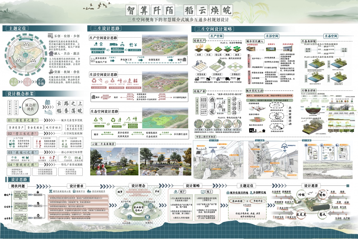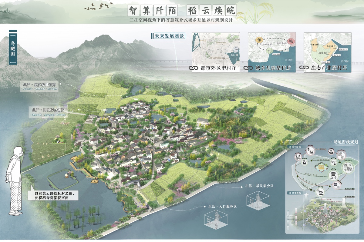 设计以“生产、生活、生态”三生融合为核心,深度整合智慧技术。生产层面,构建智慧媒介平台连接城乡,引入智慧农业技术提升本地产业效能,发展文旅及手工业等多元业态以激活经济。生活层面,创新应用黏菌算法等模型模拟并优化人流物流路径,科学布局公共空间与服务设施,显著提升村民生活便利度与游客体验舒适感,同时维护生态空间完整。生态层面,建立生态资源智慧监测体系,强化保护管理;深度挖掘其景观、康养与科普价值,通过智慧导览等设计实现生态价值的创造性转化。最终,通过线上线下融合的智慧平台促进城乡居民共治共建共享,在最大化村民福祉的同时为城市居民提供优质乡村体验,全面激活杭村内生动力,重塑乡土特色,实现可持续振兴。