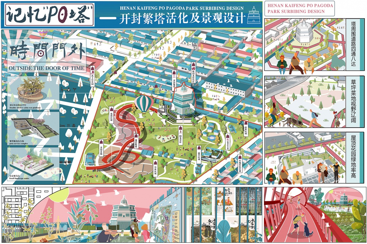 场地位于开封市禹王台区繁塔北街,原繁塔公园存在空间消极(道路泥泞、入口不明)、环境杂乱(垃圾散落、绿化不足)等问题,规划面积扩展至 65000㎡,涵盖繁塔本体、周边老旧民居及与禹王台公园连接区域,需整合商贩用地、绿地等五类用地,构建功能复合的公园空间。以繁塔文化遗产保护与活化为核心,一是重现历史记忆,保护繁塔原真性,合理布局功能区;二是融文化于景观,用植物、佛洞元素营造氛围;三是借数字技术增强互动,打造线上农耕体验,实现文化传承与现代休闲统一。