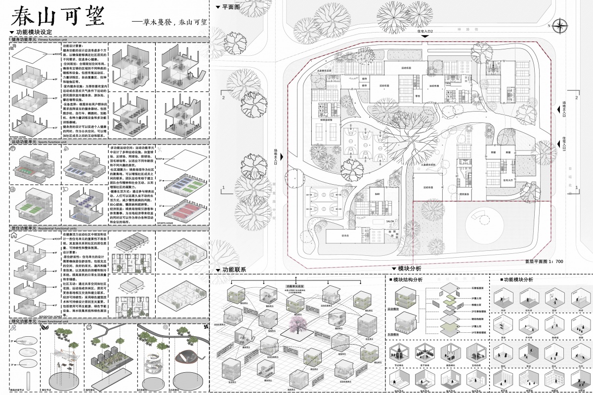 本设计意在打造一个“智能互联、健康融合”的活力运动社区。首先是全时运动活力模式。这一理念旨在通过改变现有商业模式为运动模式,打造一个全面的、有机的运动生态系统,以适应不同年龄和能力水平的社区居民的需求从根本上增加社区内的运动与活力。其次是全域运动活力模式。着重于打造一个复合功能的社区模式,利用模块化建造,通过对现有建筑和空间的重新规划与设计,将运动设施无缝集成到居民的日常生活中,同时强调自然与运动的结合,使得运动环境更加舒适宜人,同时也倡导一种健康、生态的生活方式。
