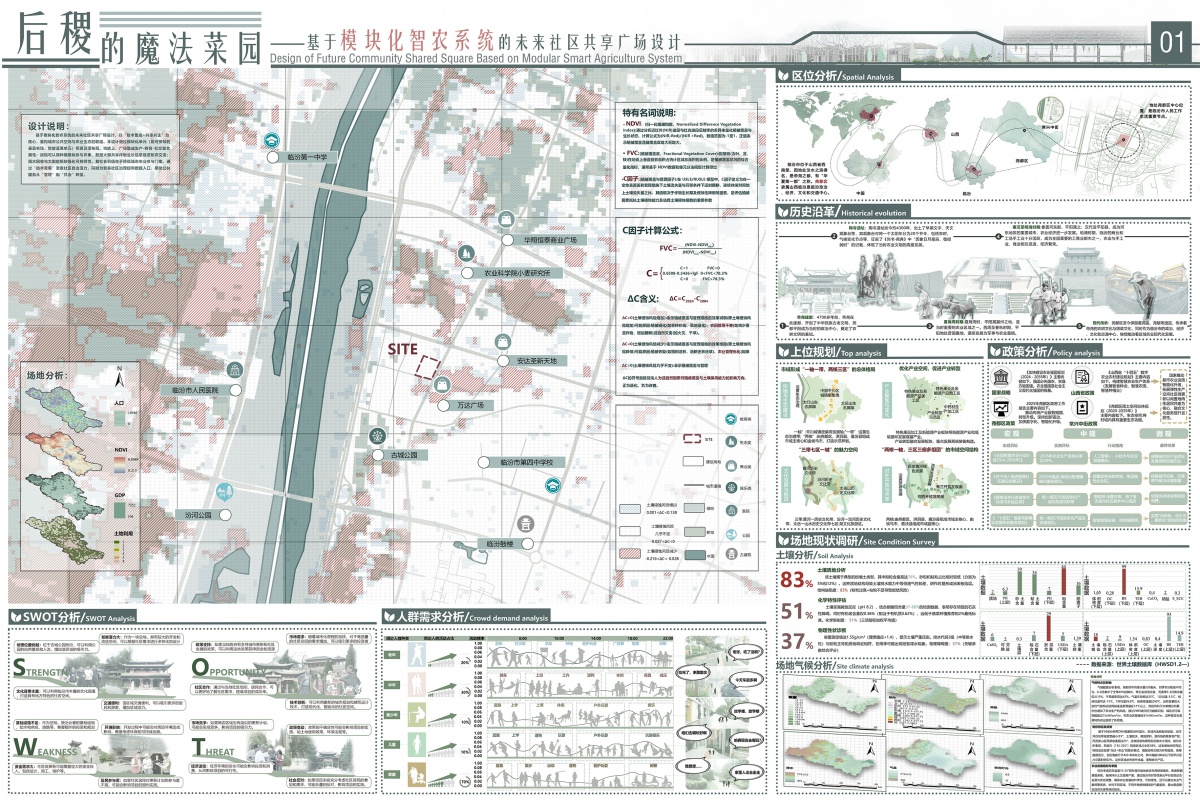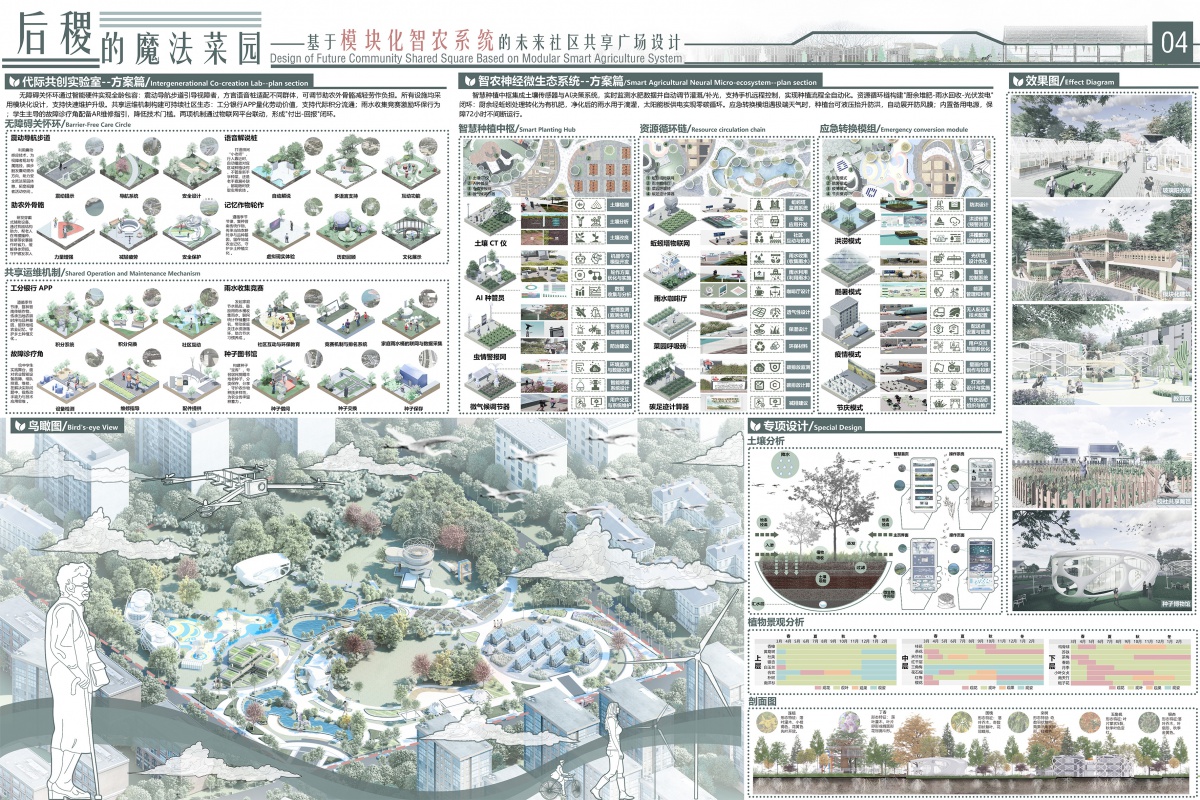 创意源于对“城市与农业割裂”问题的破解,受模块化建筑灵活性与智慧农业高效性启发,以“技术集成+共享共生”为核心,旨在重构城市公共空间与农业生态的联结。借鉴物联网在环境监测、AI在资源优化中的成熟应用,将可拼装垂直农场、智能灌溉单元等模块化形态融入广场设计,让技术成为打破社区居民参与农业门槛的桥梁,同时呼应智慧社区“共治”理念,激活公共空间的生产与社交价值。