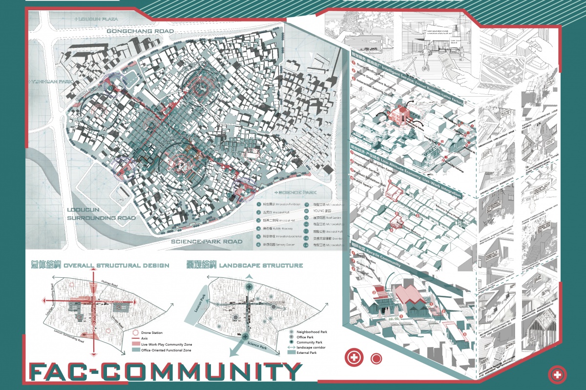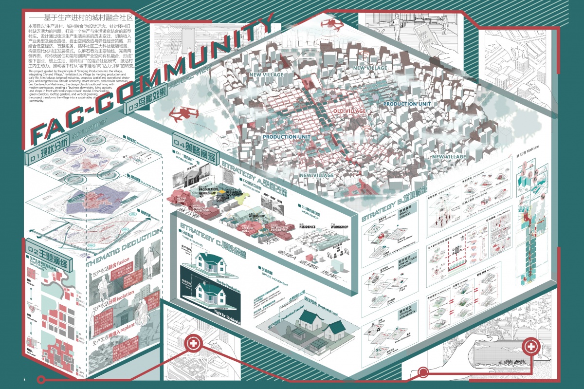 本设计以“生产进村,城村融合”为核心设计理念,旨在应对楼村旧村活力不足、空间利用效率低、产业更新滞后的现实问题,探索城中村在现代城市发展格局中的再生路径。设计团队在深入研究楼村历史发展脉络的基础上,梳理了生产与生活关系的演变过程,明确未来村庄应引入的产业类型及其与原有居住肌理的融合方式,提出“产业嵌入式更新”策略。设计以麻石巷为主要发展轴线,通过空间界面重塑,优化街巷尺度和人居体验,同时保留村落原有的生活肌理。沿线布局集创新创业、智能服务与社区生活于一体的多功能空间,探索“楼下创业、楼上生活、前商后厂”的混合型社区模式,实现住商产高度耦合。设计同步引入低空经济试验场景、社区智慧治理系统与资源循环利用机制,构建技术赋能下的未来村庄图景。通过弹性空间改造与多元经营模式激发居民主体性,增强社区内生动力,助力楼村从“城市洼地”跃升为具备持续创新力与文化凝聚力的“活力引擎”,为深圳城中村更新提供可复制、可推广的样本。