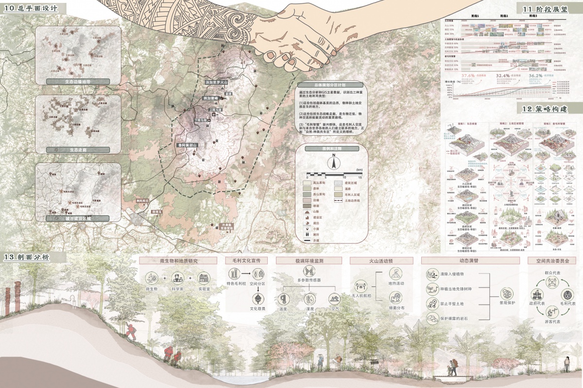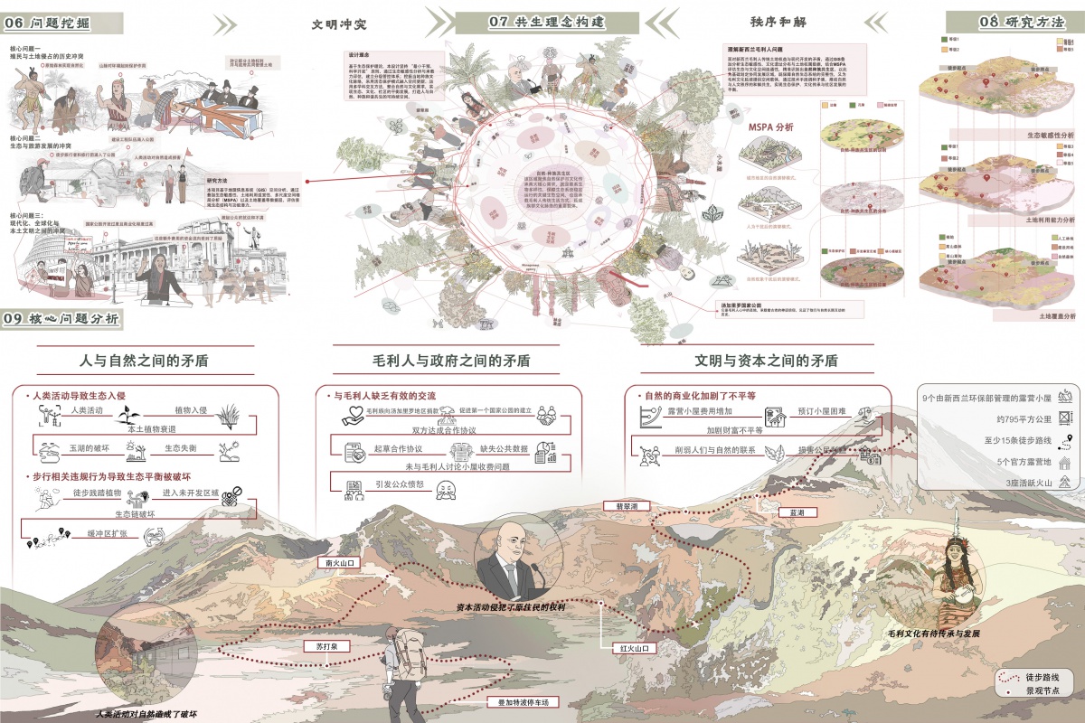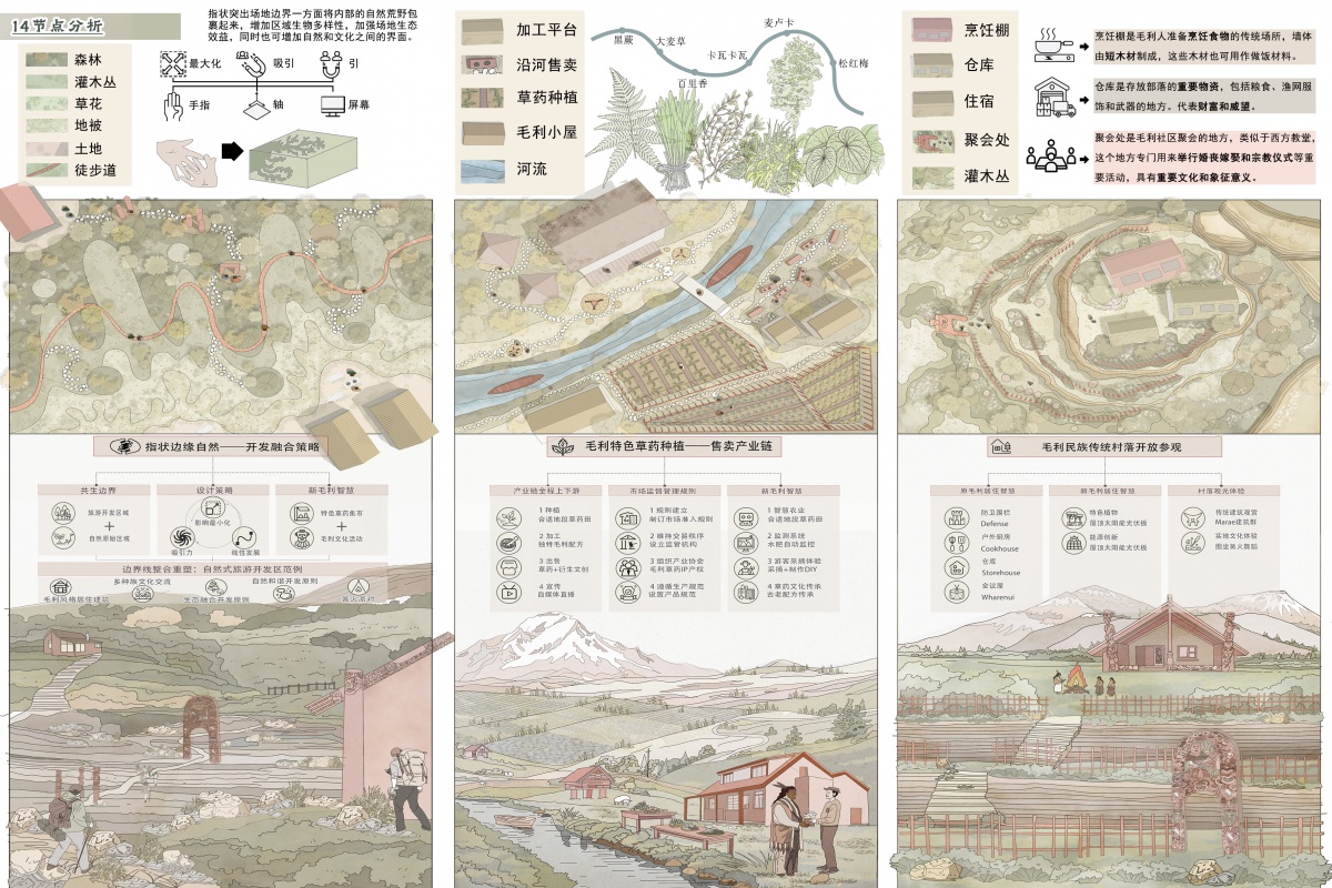 本设计围绕汤加里罗国家公园独特价值,秉持“生态共融、文化传承、发展协同”理念,聚焦三类特色节点。运用生态基底分析、文化场景营造技术,通过 “指纹边缘自然”,借空间策略,激活边缘生态与文化交流;构建“毛利特色草药种植—售卖产业链”,融合加工平台、沿河售卖等功能,传承毛利传统并赋能经济;打造“毛利民族传统村落开放参观”场景,以烹饪棚、仓库等承载文化,促进多元群体互动。