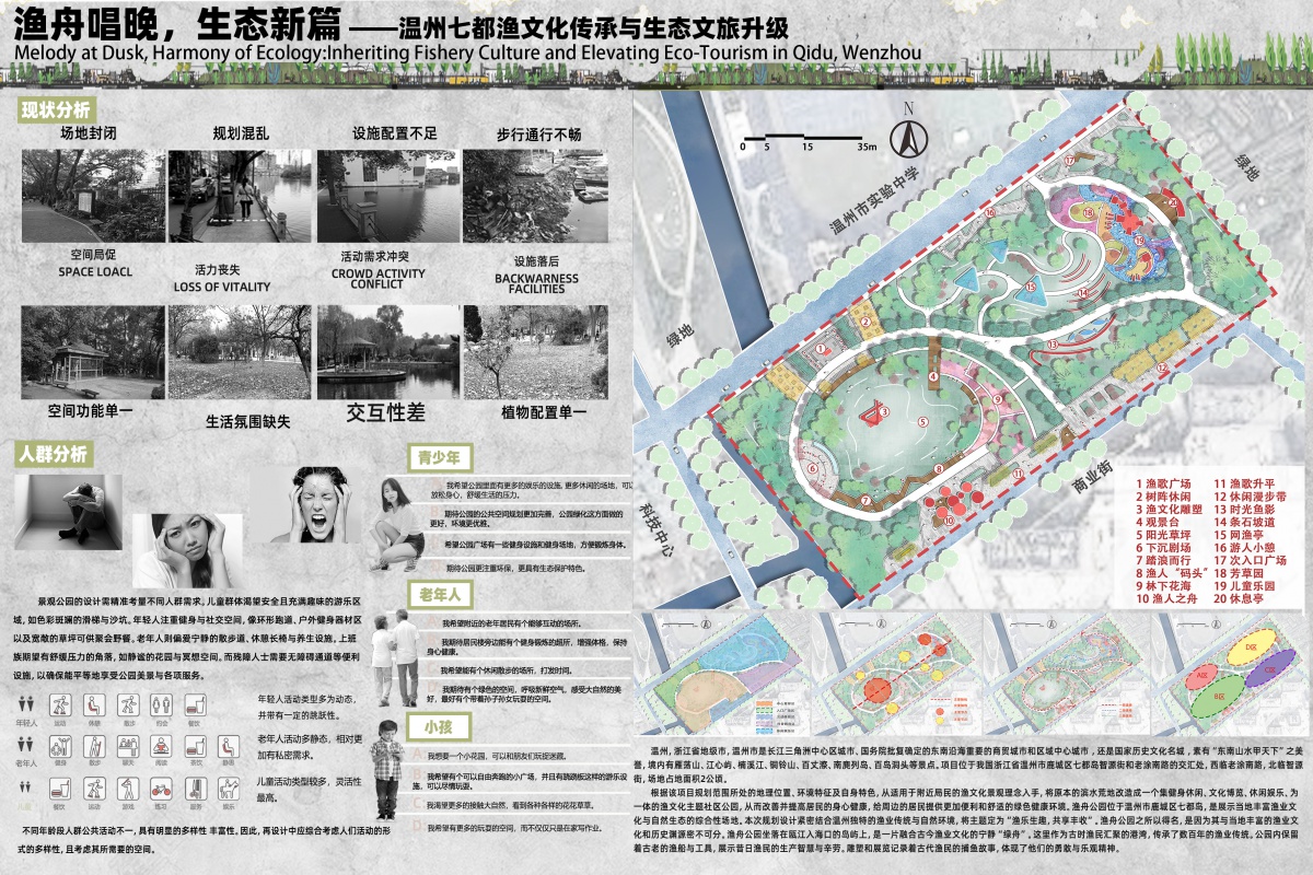 滨水区域,依 “鱼群洄游” 形态规划蜿蜒步道,串联起生态净化花园、渔文化主题广场等功能节点,同时布置岛屿状休憩平台,强化亲水体验。外围以林地为生态基底,“文化体验带” 与 “休闲游憩带” 双环联动格局。
