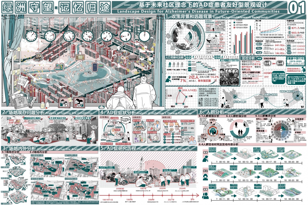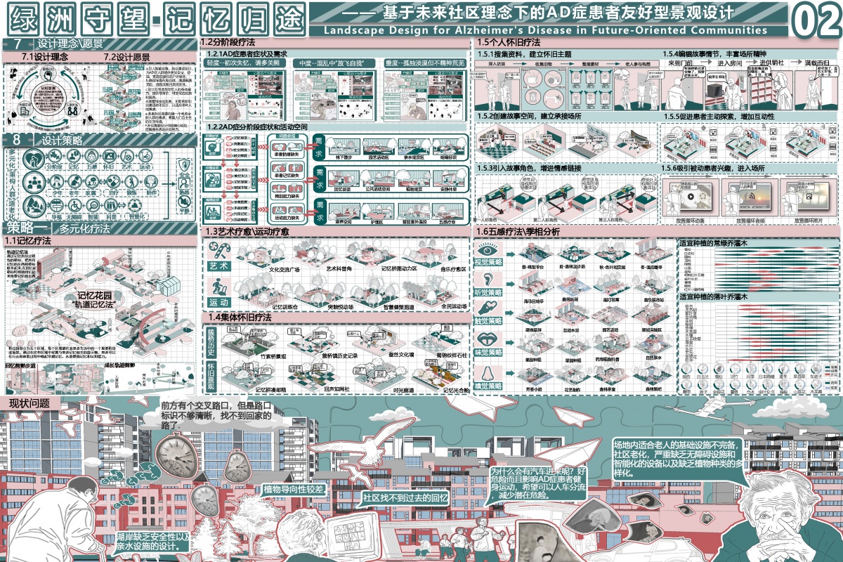 本张展板总体为项目开展的前期分析,包括场地现状的鸟瞰图,旨在宏观展示场地现状的总体情况,右上部分是项目背景的数据展示,包括老龄化程度,AD症患病率及项目选址的原因。其次是针对于场地现状的更加细致的问题分析,例如交通、基础设施、绿化、人群类型及需求等问题,也涵盖了AD症状和研究历程的分析,得出非药物治疗能够很大程度上缓解AD患者的症状,并且比药物治疗更加安全有效。