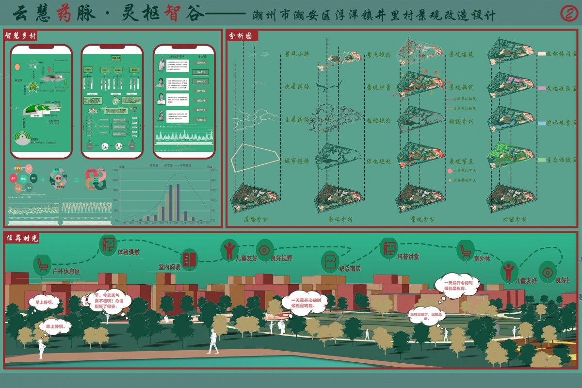 本设计推动乡村振兴以及全面绿色型发展,将产业、文化、生态进行策略改造,走生态优先、绿色发展之路。井里村素有“中医药之乡”的美称,因此,针对该优势,设计了中医药田地以及研学基地等可大力发展并弘扬中医药文化的景观节点。建设美丽乡村,走可持续化道路。