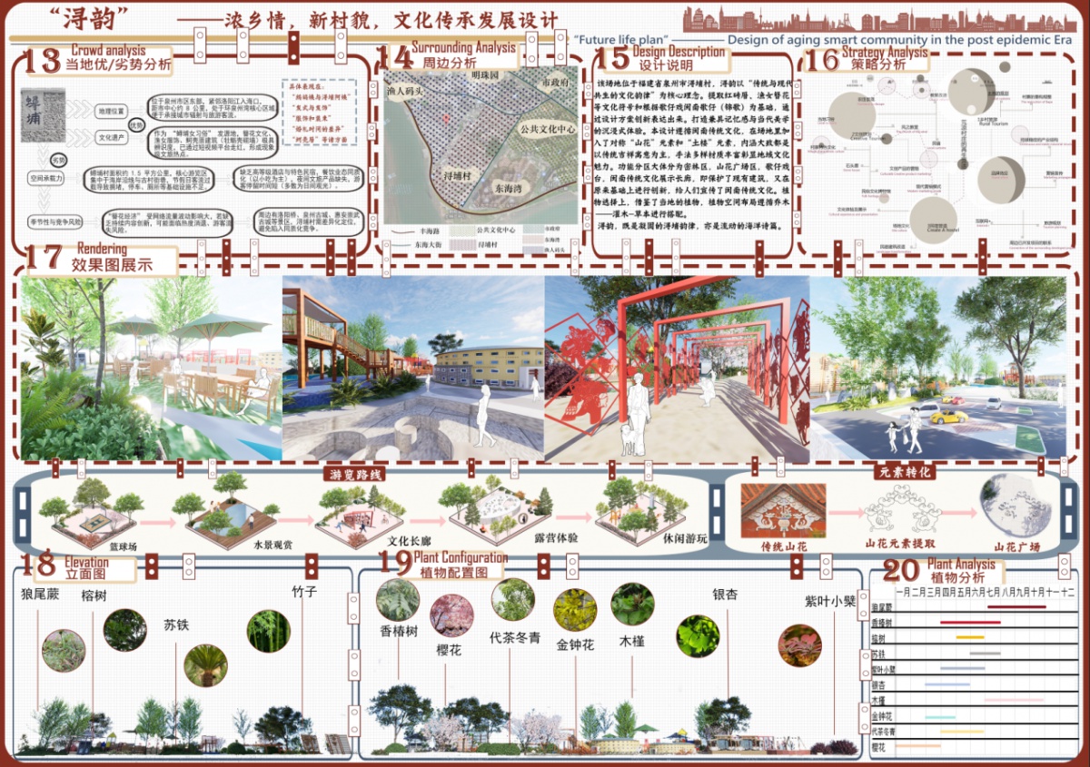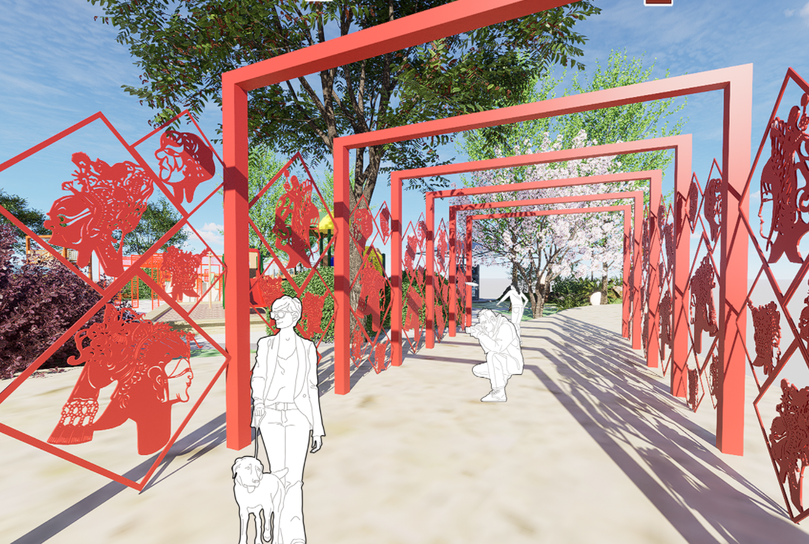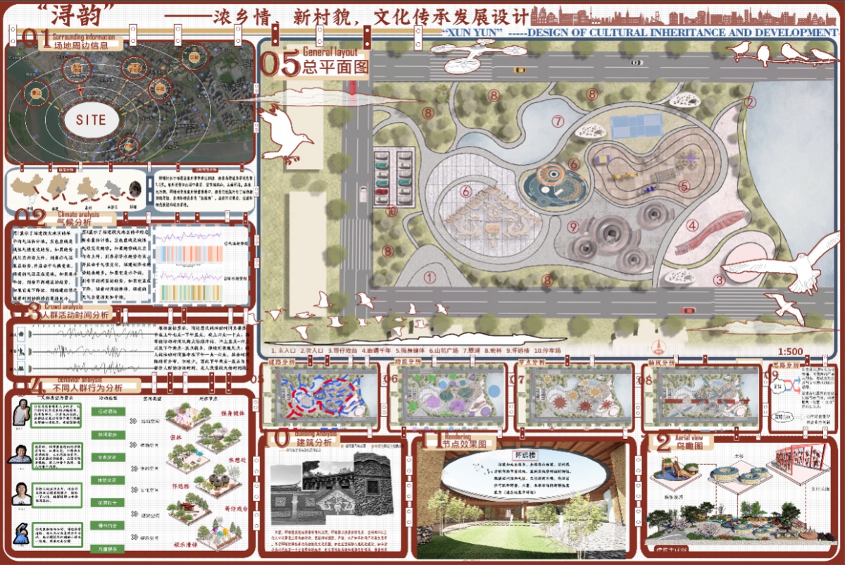 浔韵以“传统与现代共生的文化韵律”为核心理念,提取红砖厝、渔女簪花等文化符号和根据歌仔戏闽南歌仔(锦歌)为基础,通过设计方案创新表达出来。打造兼具记忆感与当代美学的沉浸式体验。本设计遵循闽南传统文化,在场地里加入了对称“山花”元素和“土楼”元素,内涵大致都是以传统吉祥寓意为主,手法多样材质丰富彰显地域文化魅力。功能分区大体分为密林区,山花广场区,歌仔戏台,闽南传统文化展示长廊,即保护了现有建筑,又在原来基础上进行创新,给人们宣传了闽南传统文化。此外,还能拉动经济增长,激发当地居民的文化认同感与参与感,将文化资源转化为可传播可消费的产品与服务,形成文旅经济与文化传承的良性循环。