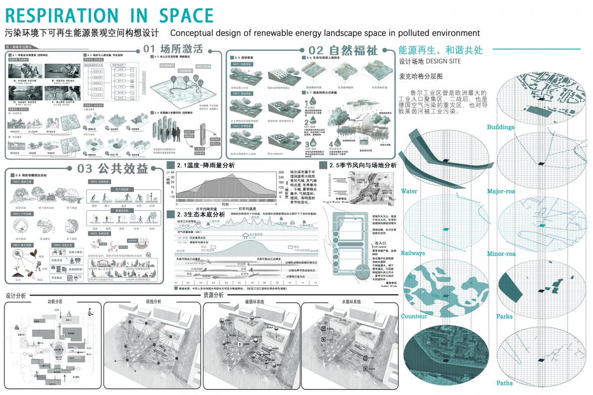 再呼吸一污染环境下可再生能源景观空间构象设计是选址在德国鲁尔工业区,该工业区污染严重。通过系统分析场地与人群需求,甚至到气候,发现这些问题并找出了矛盾点,提出了能源循环与再生的设计概念,并开门见山的展示了设计成果
