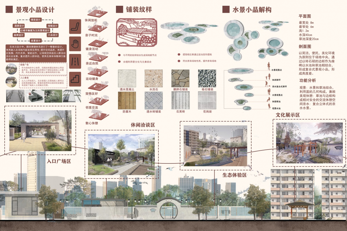 文化类小品结合晋商文化,打造富有晋元素的垃圾桶、标识牌;生态类小品结合雨水花园设计科普展示装置;休闲类小品采用木质、石材材质,营造自然舒适的休憩空间。所有小品设计注重实用性与艺术性统一,强化场地文化辨识度。铺装采用 “材质分层、纹样叙事” 的设计手法:入口广场区以花岗岩为基底,镶嵌青铜晋商地图纹样;文化展示区运用青砖灰瓦,拼贴商号招牌图案;休闲娱乐区采用彩色透水混凝土,设计趣味几何图案;生态体验区使用防腐木与碎石,模拟自然肌理,实现铺装功能与文化表达的有机融合。
