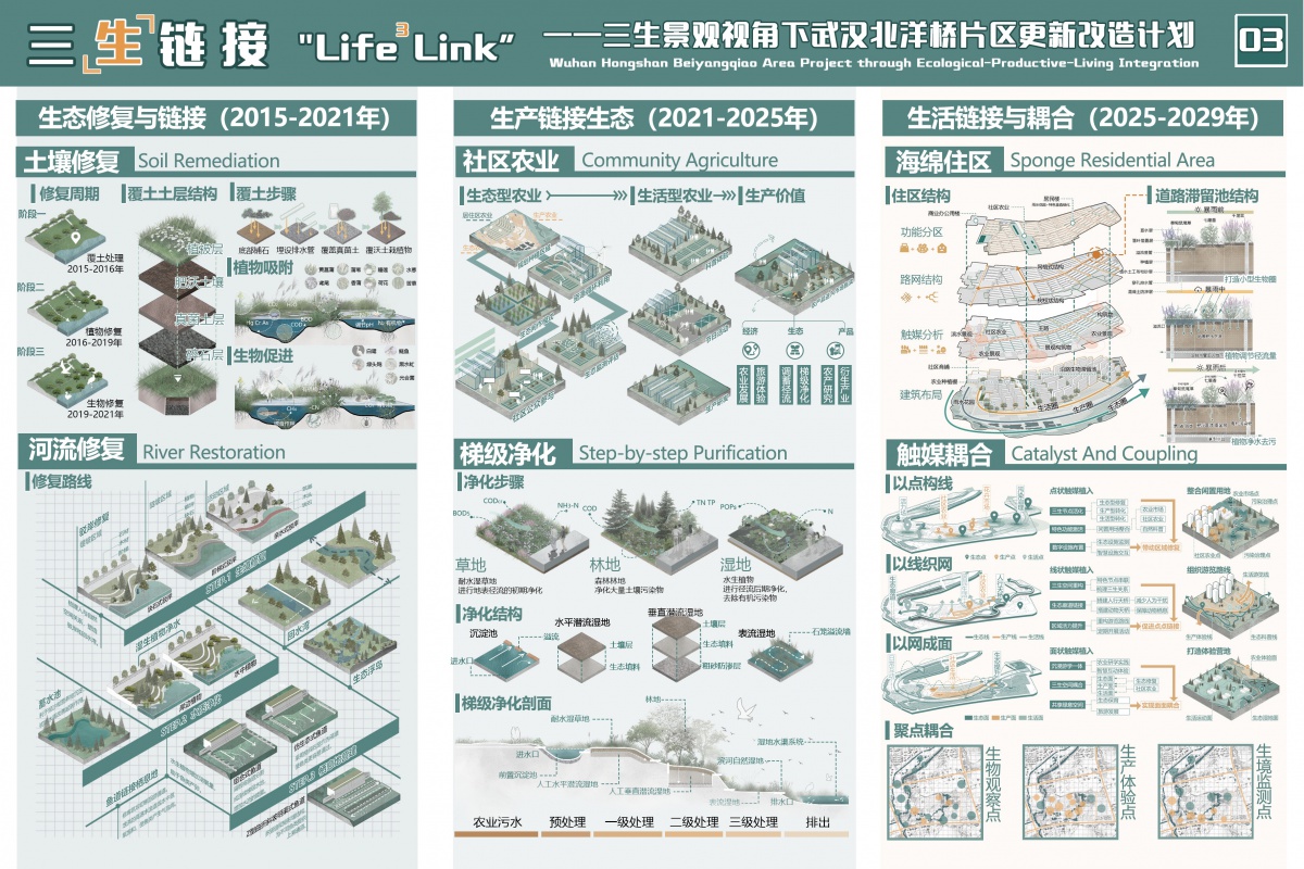 方案以“三生景观”理论为框架,清晰提出“修复—链接—耦合”的渐进式路径,将复杂的土地污染、生态断裂与社区更新问题拆解并逐步解决,逻辑缜密且富有前瞻性。设计中以河漫滩湿地为切入点,利用自然演替过程实现净水与土壤修复,具备高度的可操作性;通过废弃土地向生产性与旅游性农田的转化,创造经济与生态双赢的空间;同时,生态型社区和步道的营造,为居民提供了融合生态体验与城市便利的宜居环境,为城市更新提供了兼具理论深度与实践价值的范式。