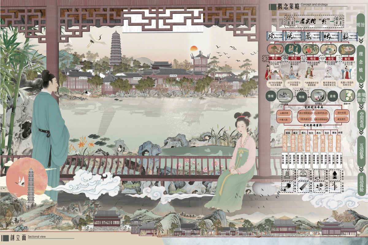 当前的许多园林的复原设计仅仅从历史脉络进行设计,此次设计创新融合现代科技,通过AR设备重现历史影像,AI系统智能调节光影声香,使游客在五感沉浸中体验古典虚实美学与数字技术的共生对话,让这座临水而筑的塔影园既延续虎丘千年文脉,又成为连接传统与未来的文化场域。