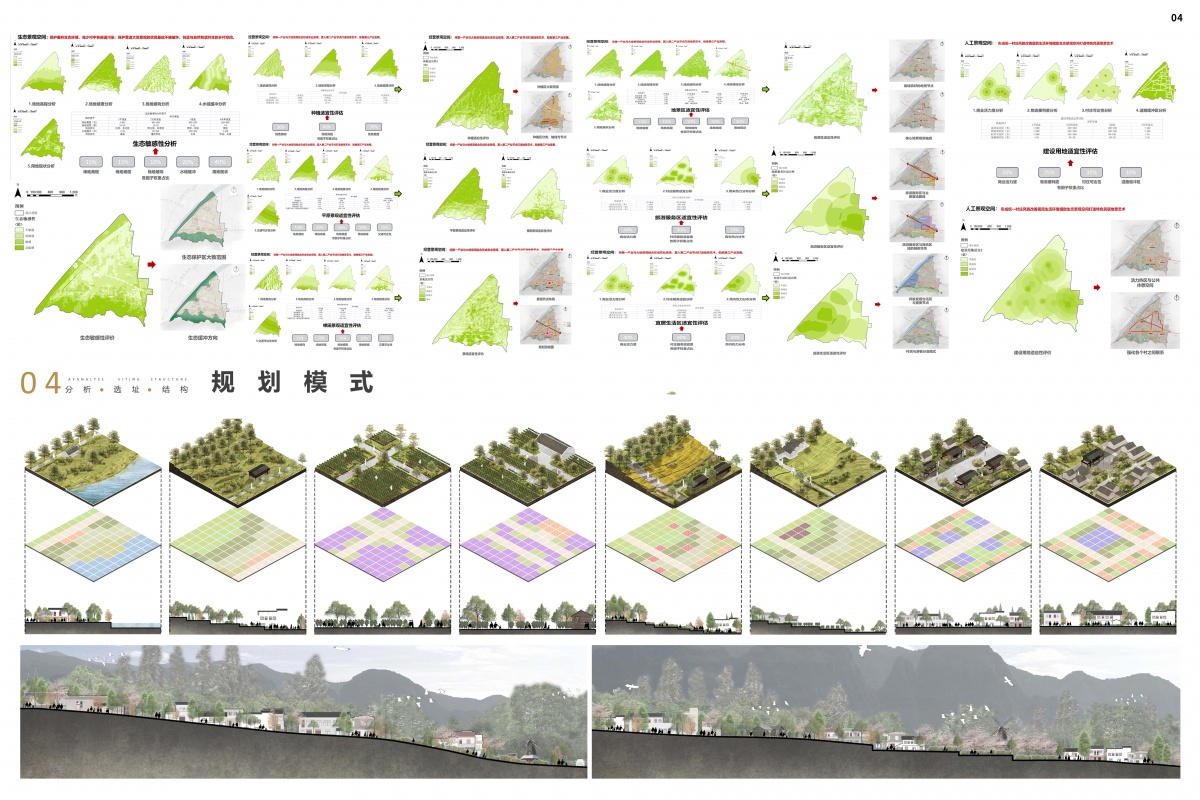 我们从生态敏感、种植适宜性、景观适宜性、地景区适宜性、建设用地适宜性等维度下通过因子权重等数据处理和分析,打造以核心地景观赏轴为中轴线的自然、经营、人工景观融合的空间规划结构。以当地特色农产品葡萄为主要内容,基于场地已有的第一、三产业,融入了第二产业以完善当地的产业结构,同时合理分区规划,整体形成可食可赏的大地景观。
