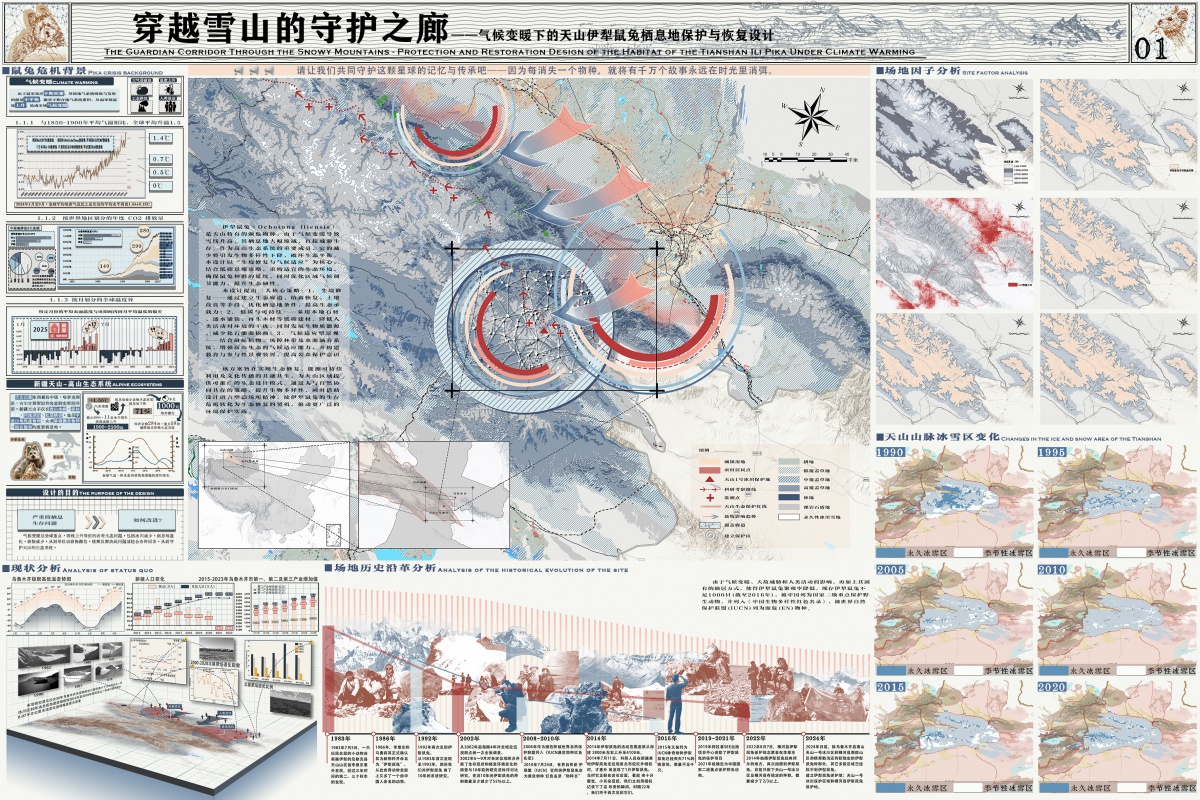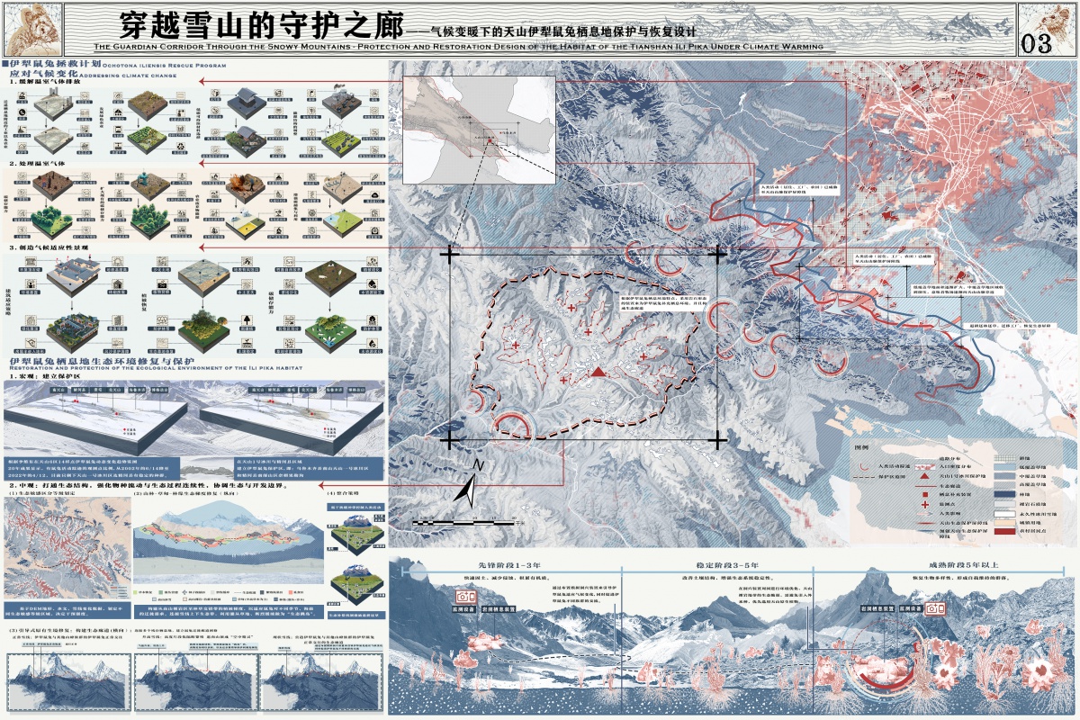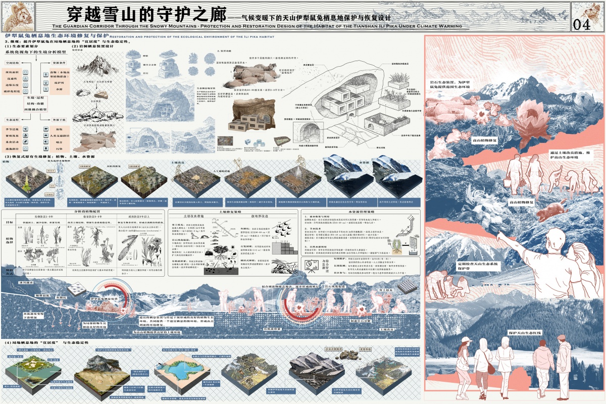 该设计聚焦天山伊犁鼠兔栖息地保护,构建 “生态修复 - 低碳干预 - 气候适应 - 公众教育” 系统方案,技术融合与可视化表达突出,为高山濒危物种保护与生态韧性提升提供了兼具科学性与示范价值的创新范式。