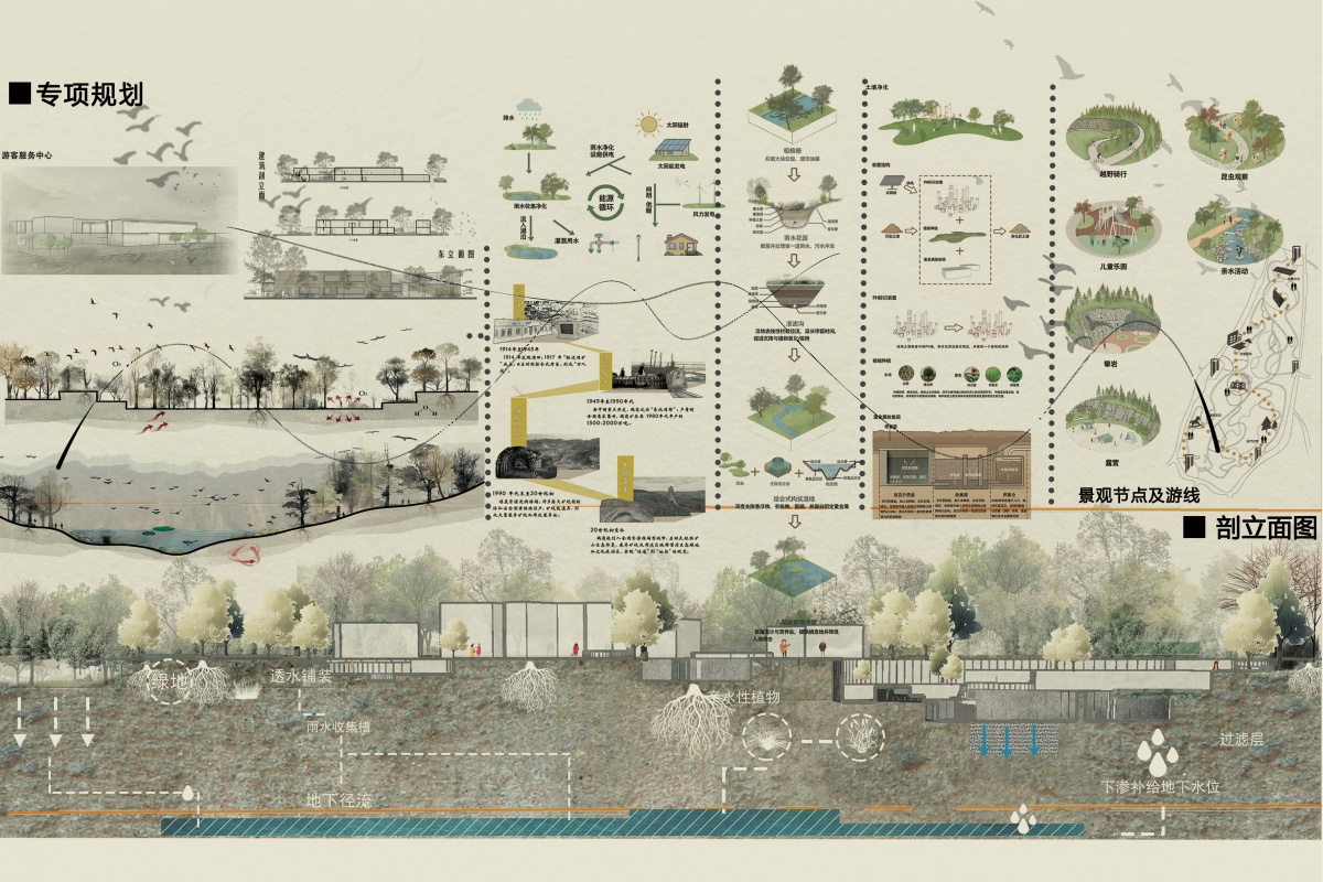 主题策略部分,从土壤,植物,宏观多方面展示场地的修复方法及修复效果,并展示场地内的各个节点功能。
