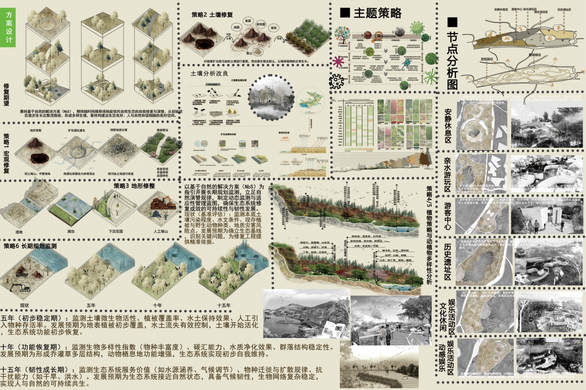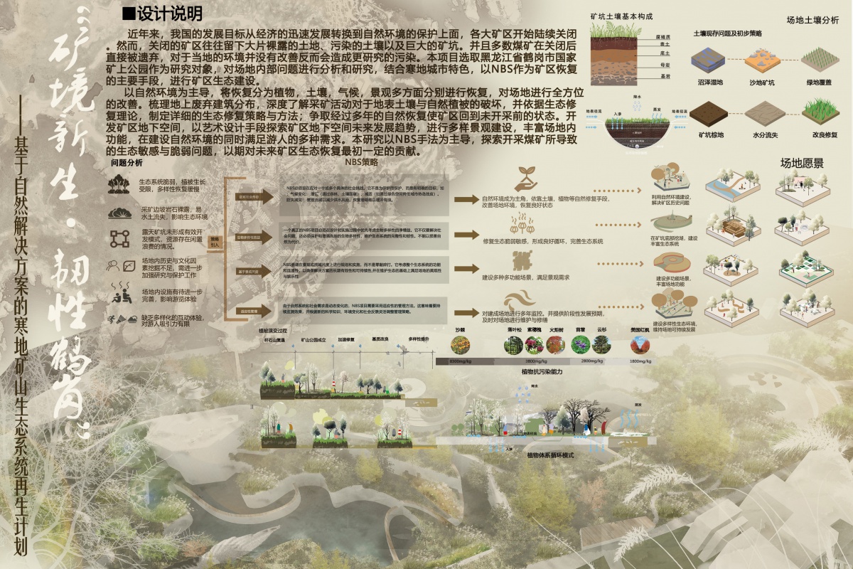 本研究以NBS手法为主导,探索开采煤矿所导致的生态敏感与脆弱问题,以期对未来矿区生态恢复作出贡献。通过本土耐寒植被重建、污染土壤分区治理与修复、微气候调控与雨水循环管理,以及景观形态恢复,构建自我维持的生态网络。同时系统梳理地上废弃建筑与采矿遗迹,采取“保留—修复—再利用”策略,结合艺术化表达与沉浸式地下空间开发,丰富游憩、科普与文化功能。方案强调长期自然驱动恢复、分期实施与适应性监测,实现生物多样性恢复与景观美学的有机统一,推动矿区由工业废墟向生态文化公园的可持续转型。设计同时优先低碳材料与低影响施工,并设置生态监测与公众参与平台,确保修复效果可视化、可持续。秉持基于自然的解决方案(NbS),期待随时间推移场地能依托自然生态的自我修复与演替,从初始状态逐步生长出繁茂植被、形成多样生境,最终构建出生态良好、人与自然和谐相融的美好空间。