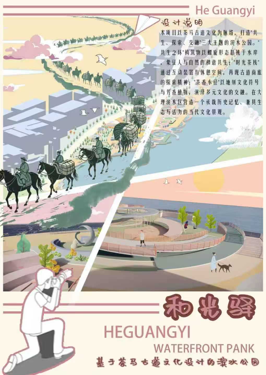 本项目以深厚的茶马古道文化为脉络,依托大理滨水区的自然景观条件,打造一个集文化体验、生态休闲与公共交流于一体的现代景观空间。设计以“共生、探索、交融”为核心主题,通过三大主体构筑与景观序列,重新诠释茶马古道的精神内涵与时代价值。